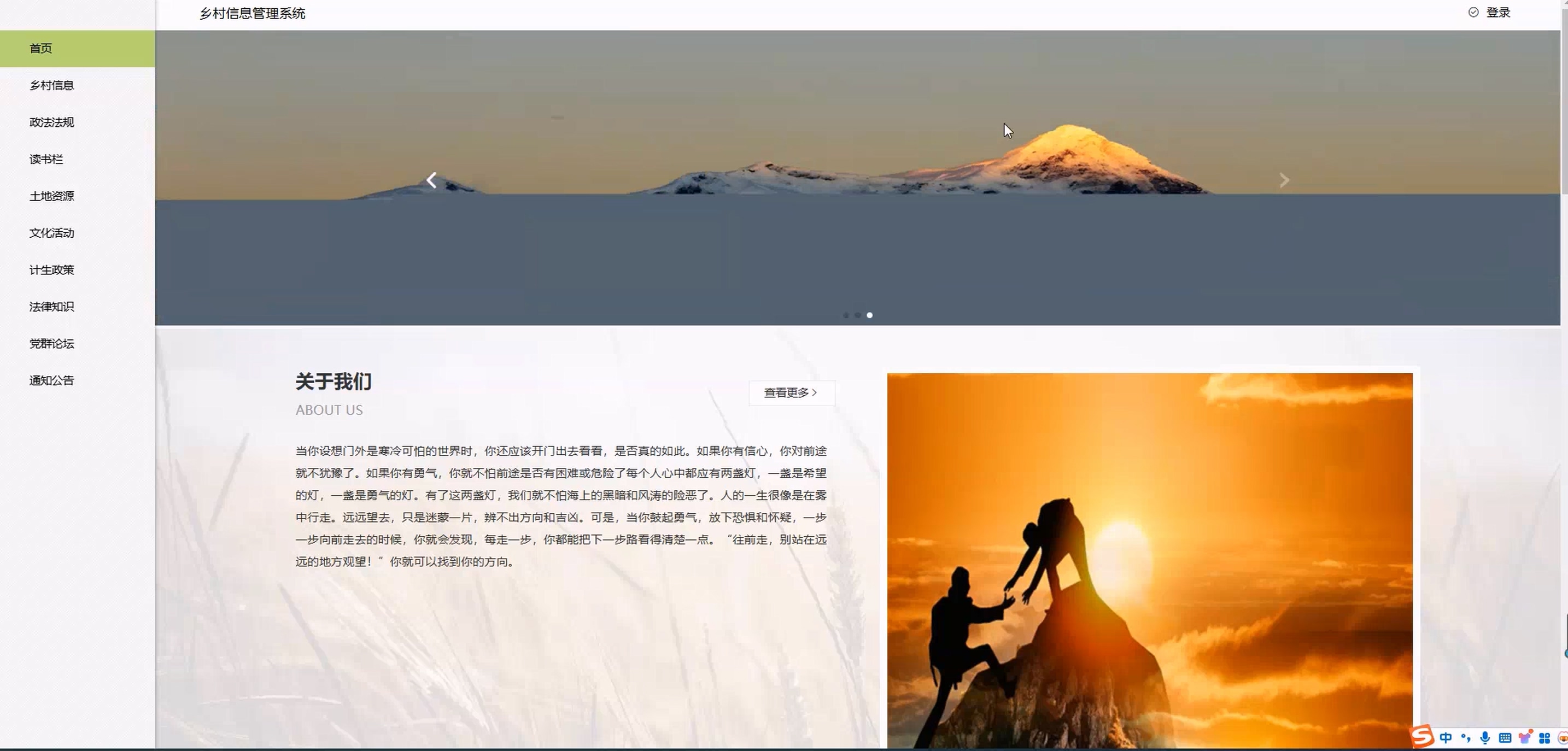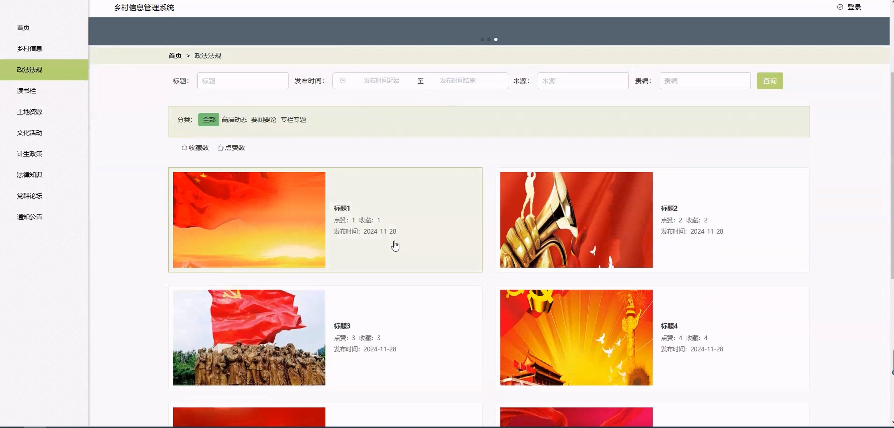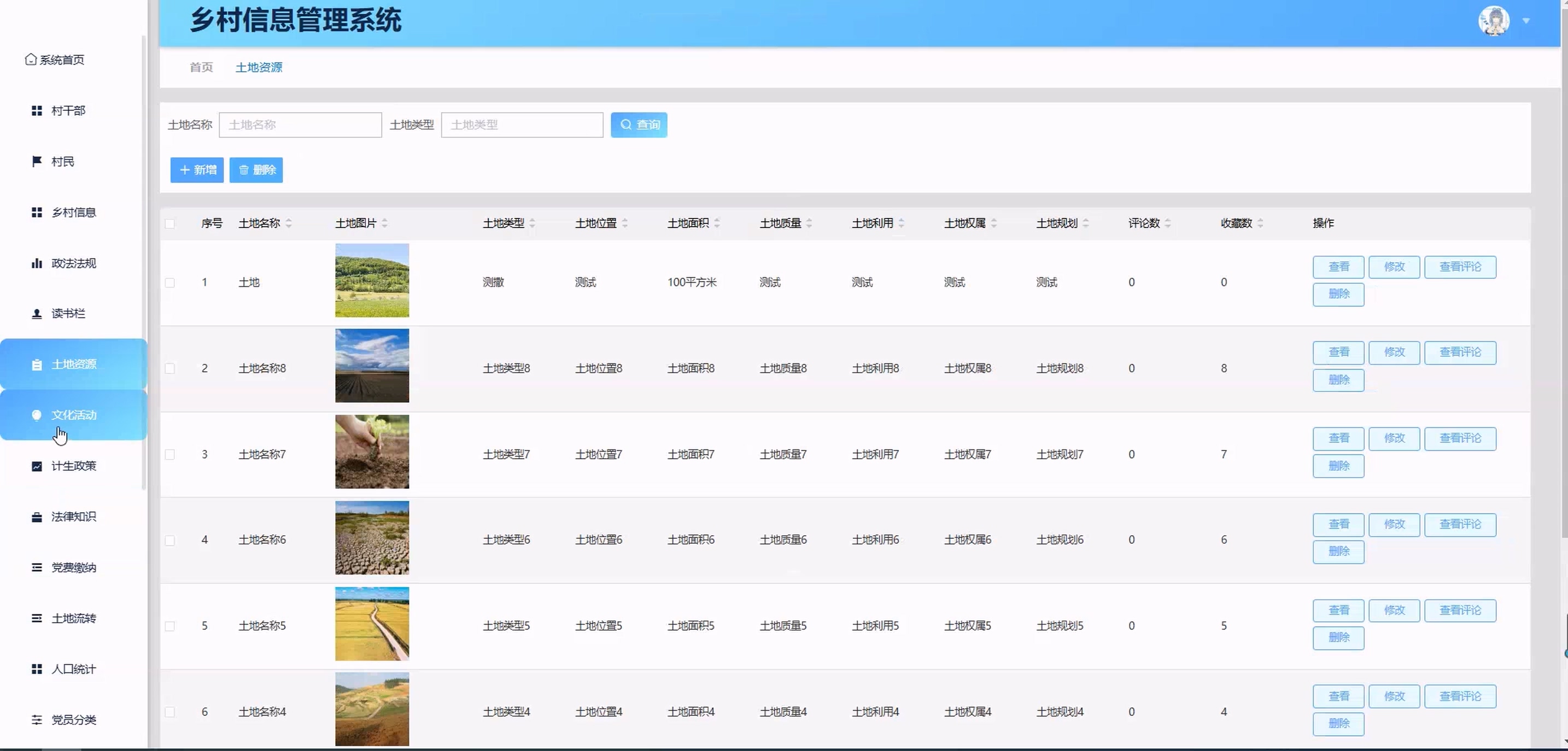 管理员:管理员主页面作为系统控制中心,提供全面的管理功能。页面通常详细列出所有管理模块,包括村干部、村民、乡村信息、政法法规、读书栏、土地资源、文化活动、计生政策、法律知识、党费缴纳、土地流转、人口统计、党员分类、党员信息、党组织活动记录、投诉建议、论坛分类、举报记录、党群论坛、系统管理、个人中心等,确保管理员能够高效地进行日常管理工作。