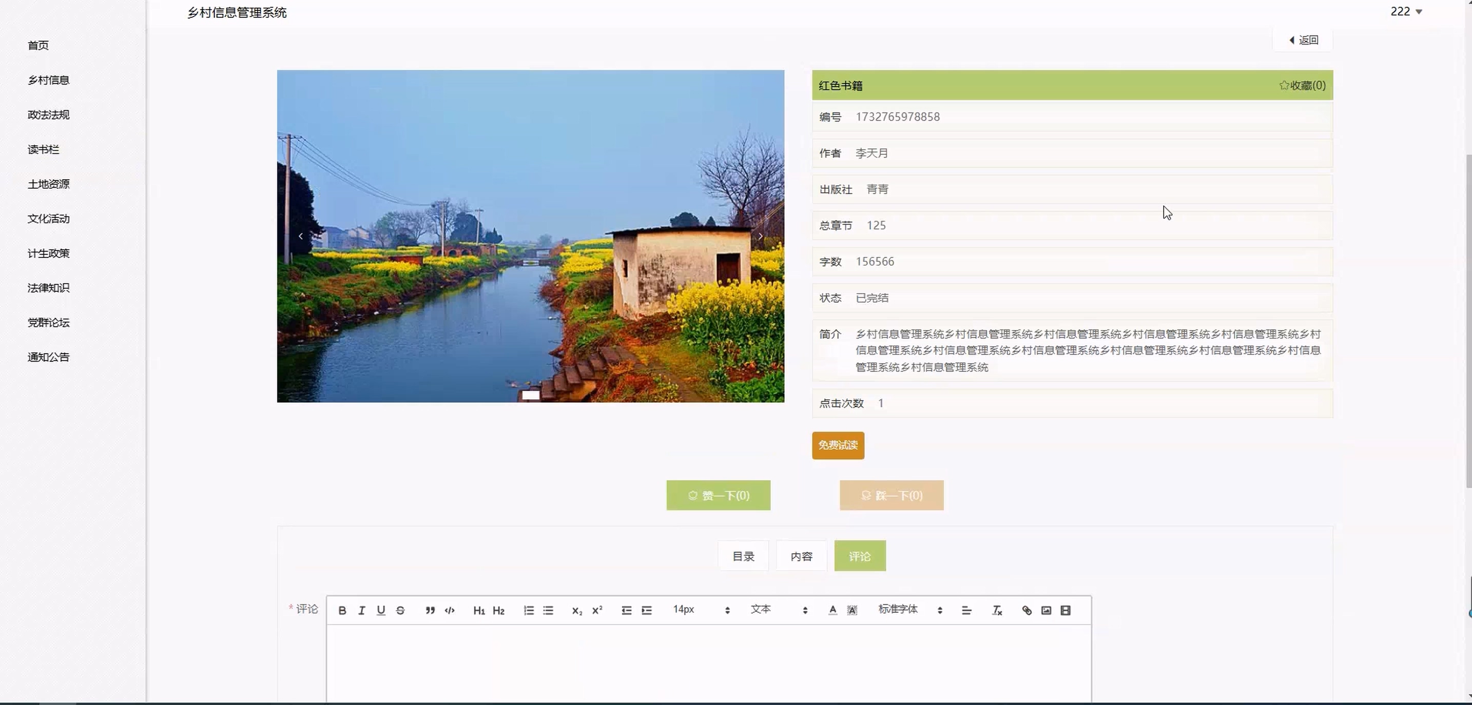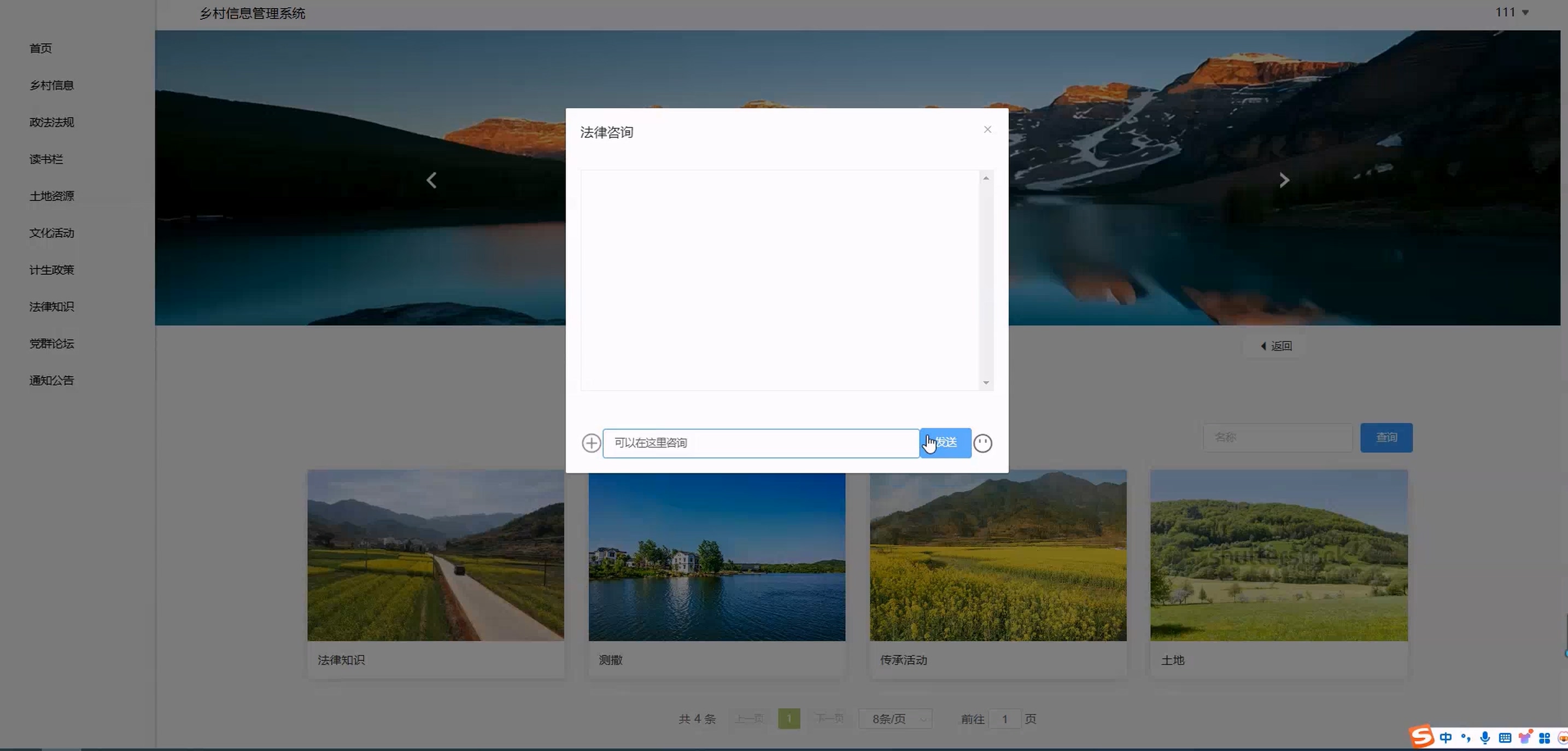 用户:系统首页精心设计了多元化的功能模块,涵盖乡村信息、政法法规、读书栏、土地资源、文化活动、计生政策、法律知识、党群论坛、通知公告、法律咨询以及个人中心等。村民通过“个人中心”功能可便捷管理个人信息。他们能随时修改密码,确保账户安全;党费缴纳功能方便党员按时完成缴费;“投诉建议”模块为村民提供反馈渠道,表达诉求、提出建议。