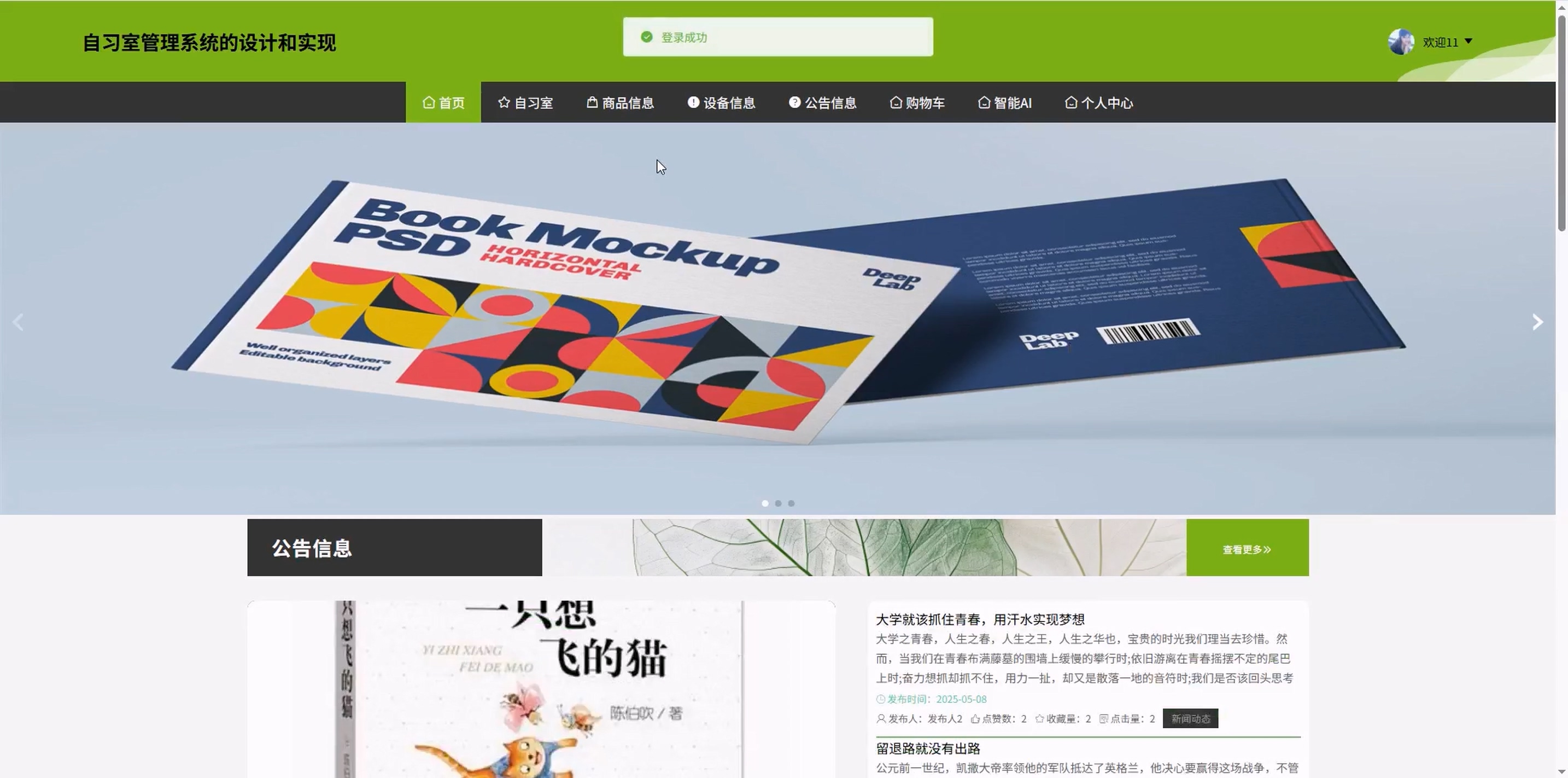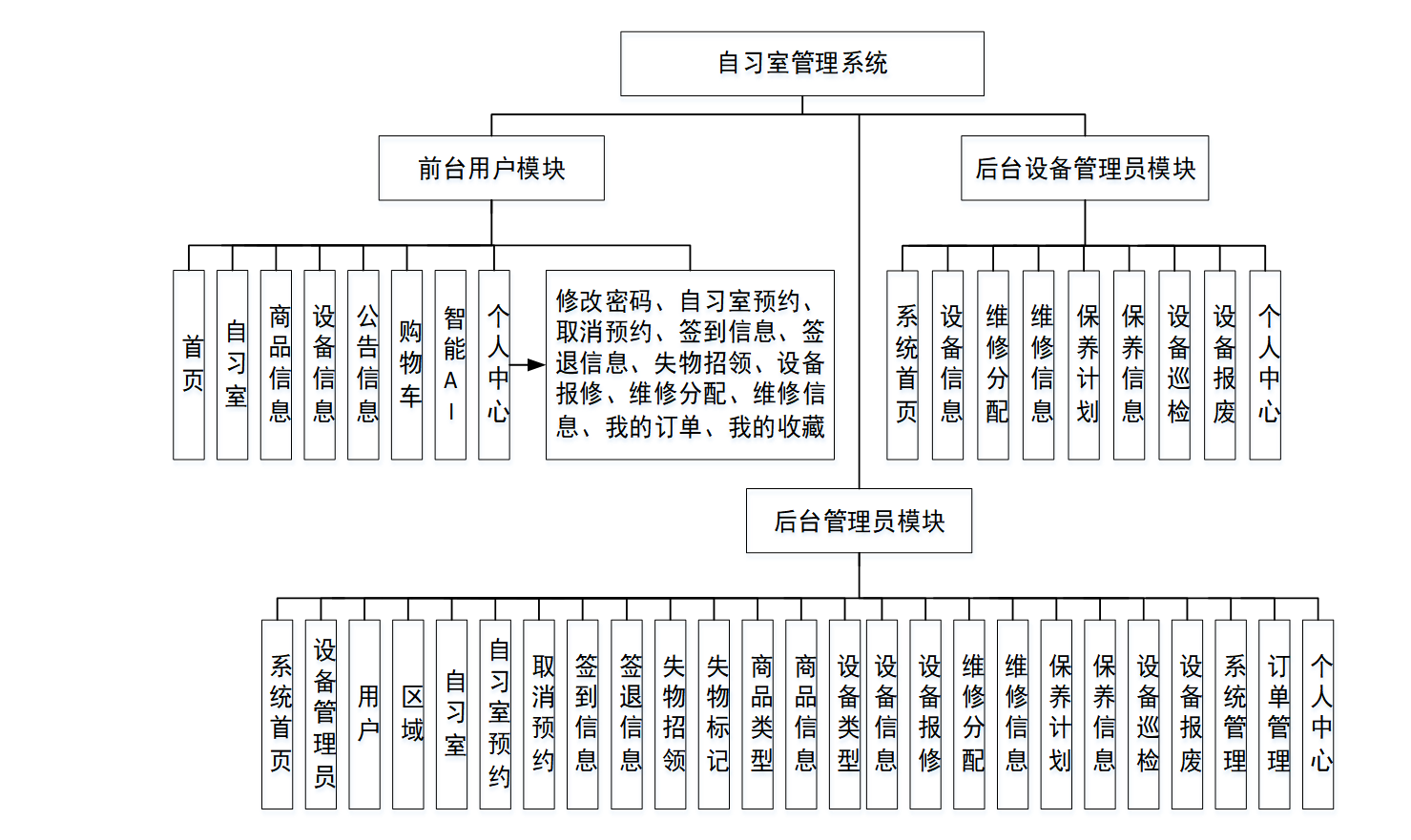 (协同过滤推荐算法+AI智能助手)基于SpringBoot的自习室管理系统包含前台用户模块、后台设备管理员模块、后台管理员模块三部分,具体功能如下: