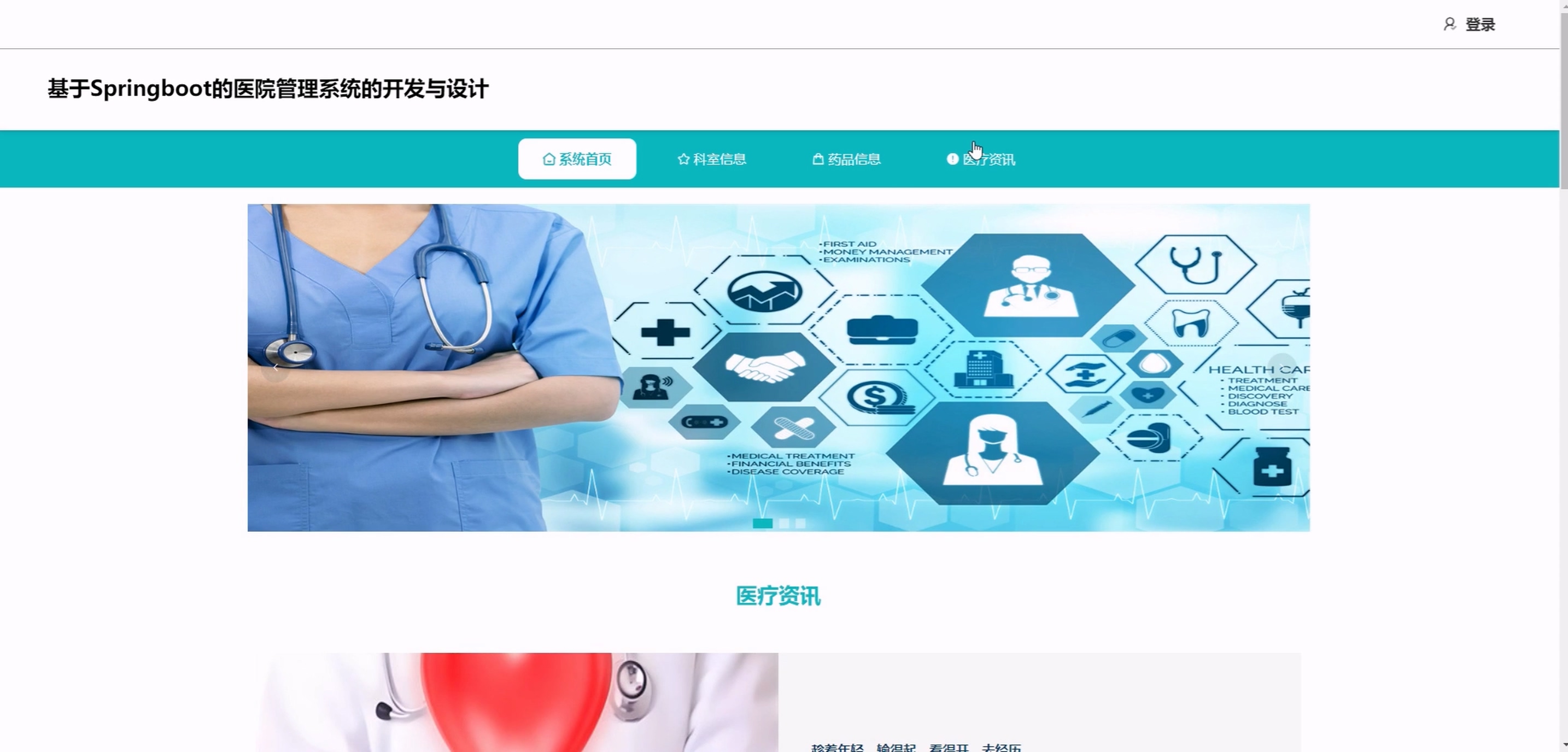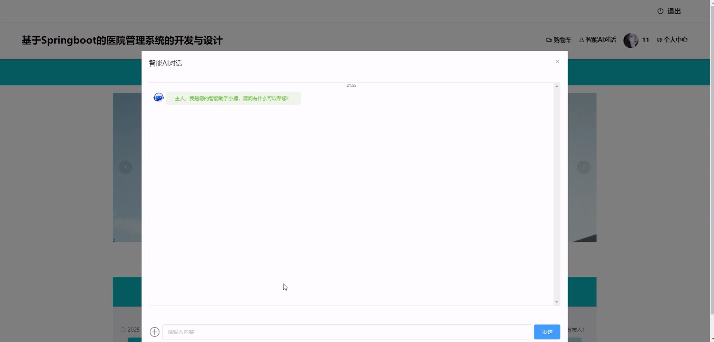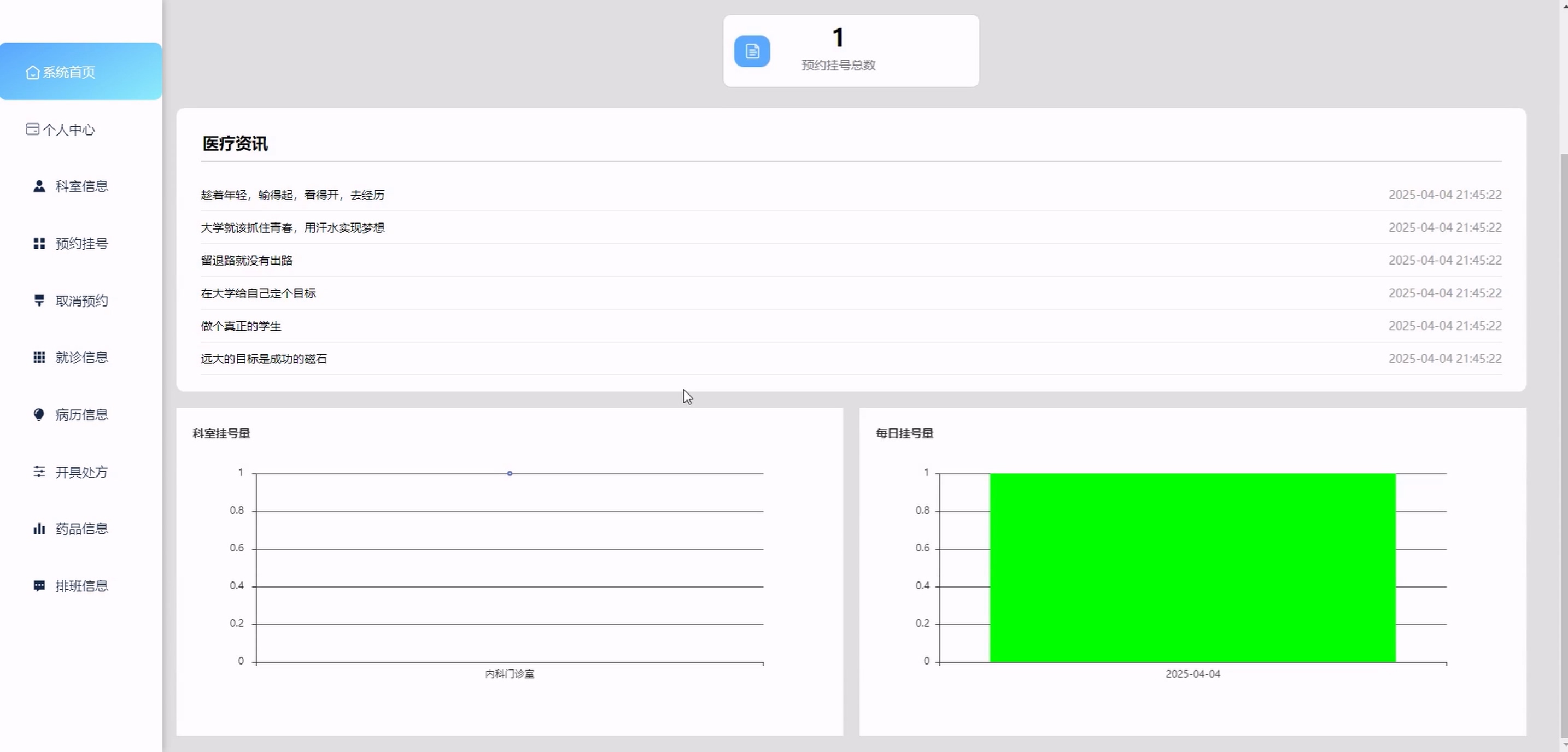 (1) 前台患者:系统首页、科室信息、药品信息、医疗资讯、购物车、智能 AI 对话、个人中心(含修改密码、预约挂号、取消预约、就诊信息、病历信息、开具处方、费用信息、我的订单、我的地址、我的收藏)
