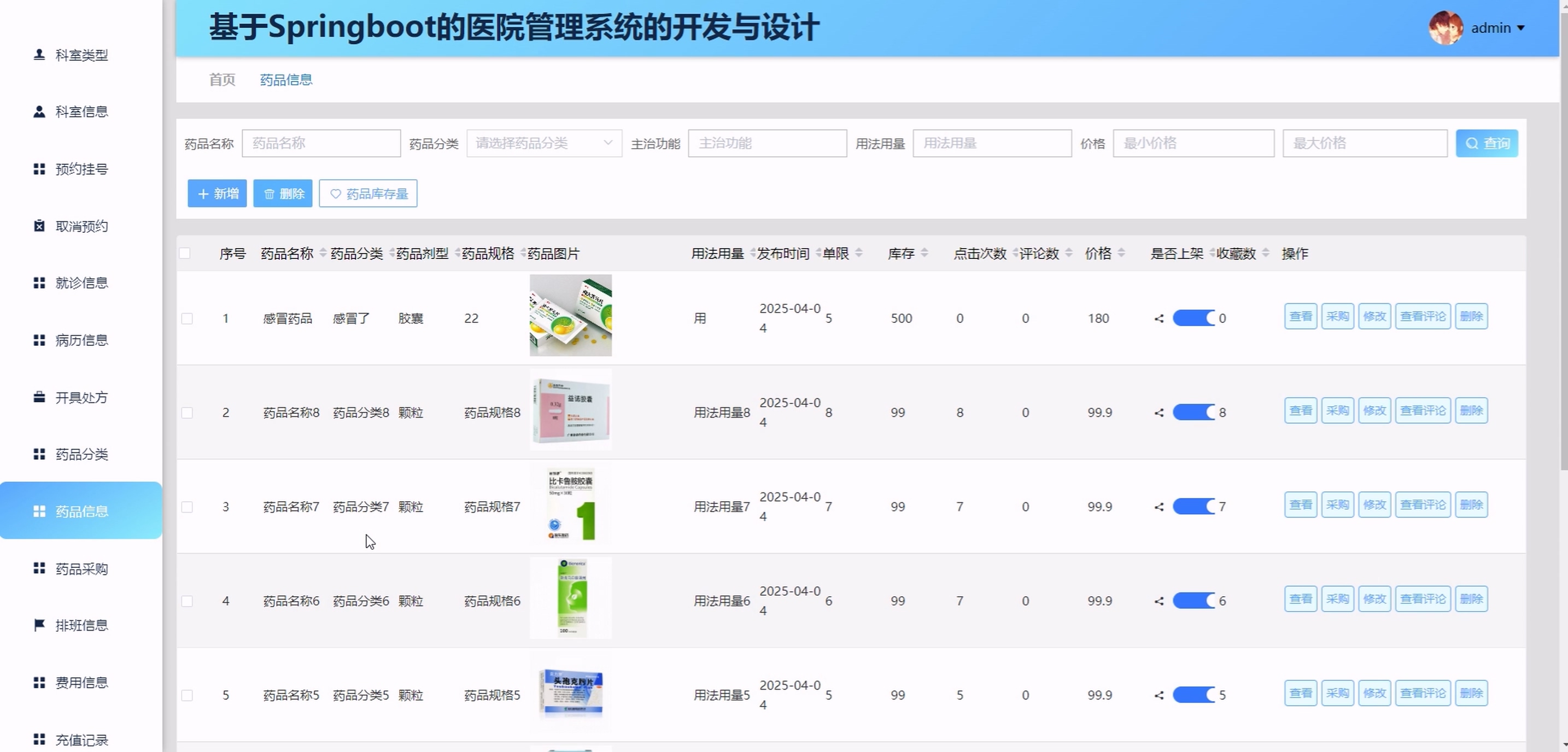 (2) 管理员(后台模块):系统首页、个人中心、患者管理、医生管理、科室类型管理、科室信息管理、预约挂号管理、取消预约管理、就诊信息管理、病历信息管理、开具处方管理、药品分类管理、药品信息管理、药品采购管理、排班信息管理、费用信息管理、充值记录管理、系统管理、订单管理
