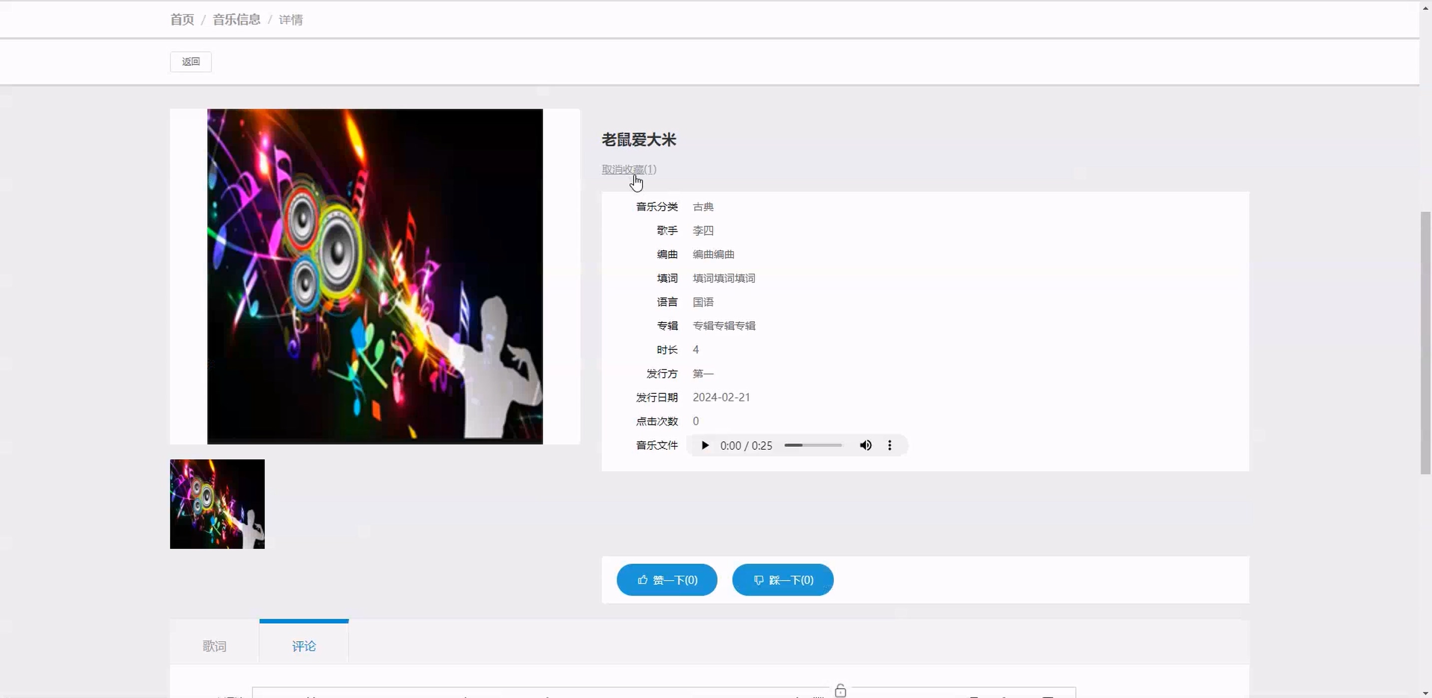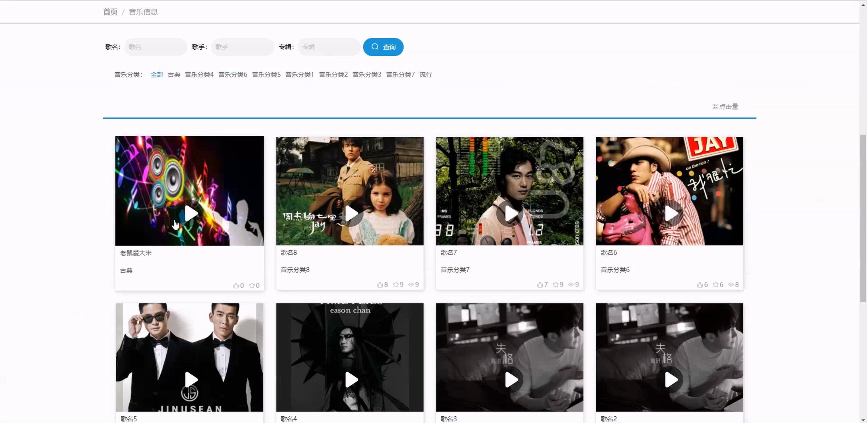 (1)前台首页:系统主页、音乐信息、歌曲数据、个人中心(含修改密码、我的收藏)