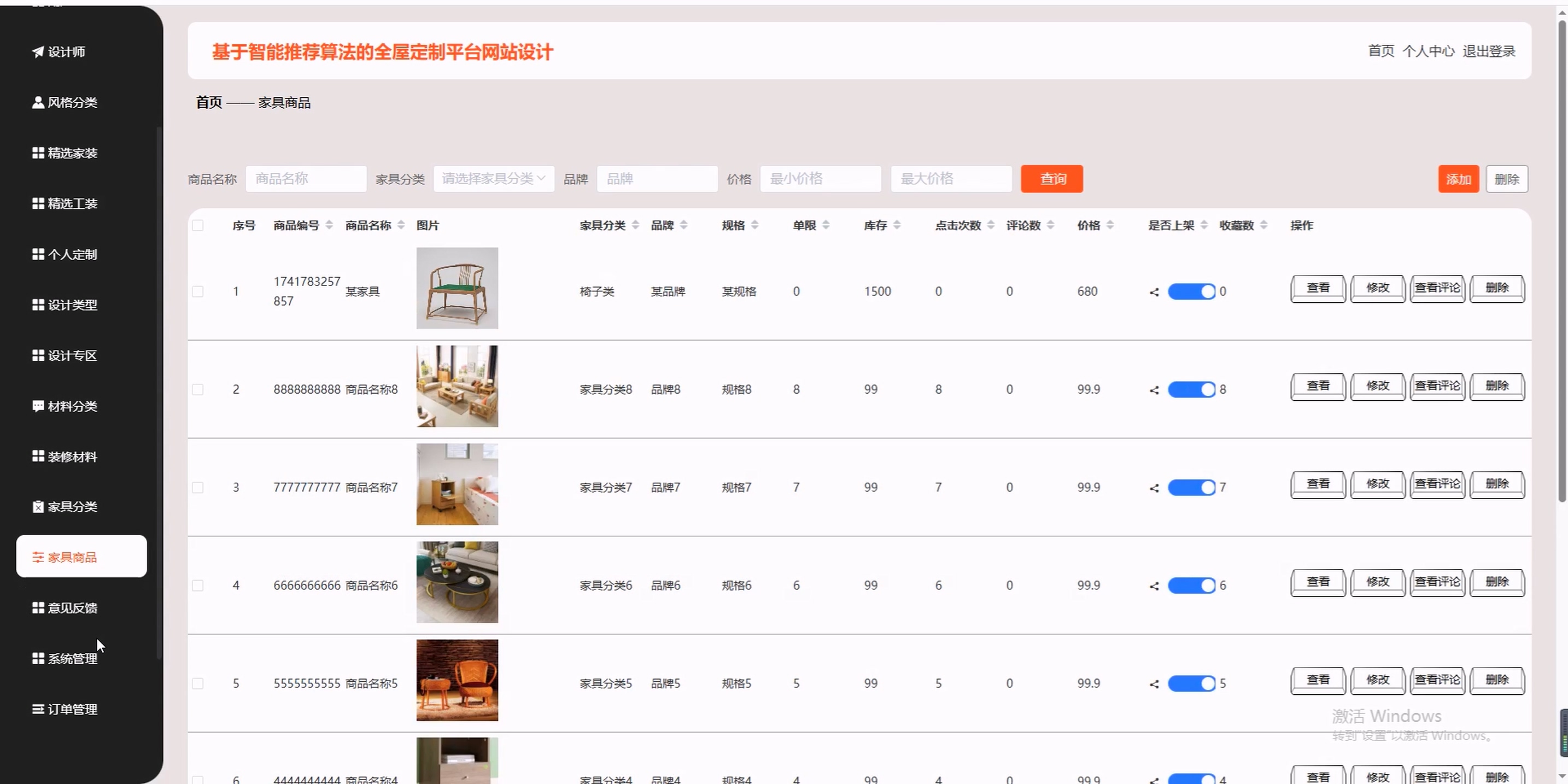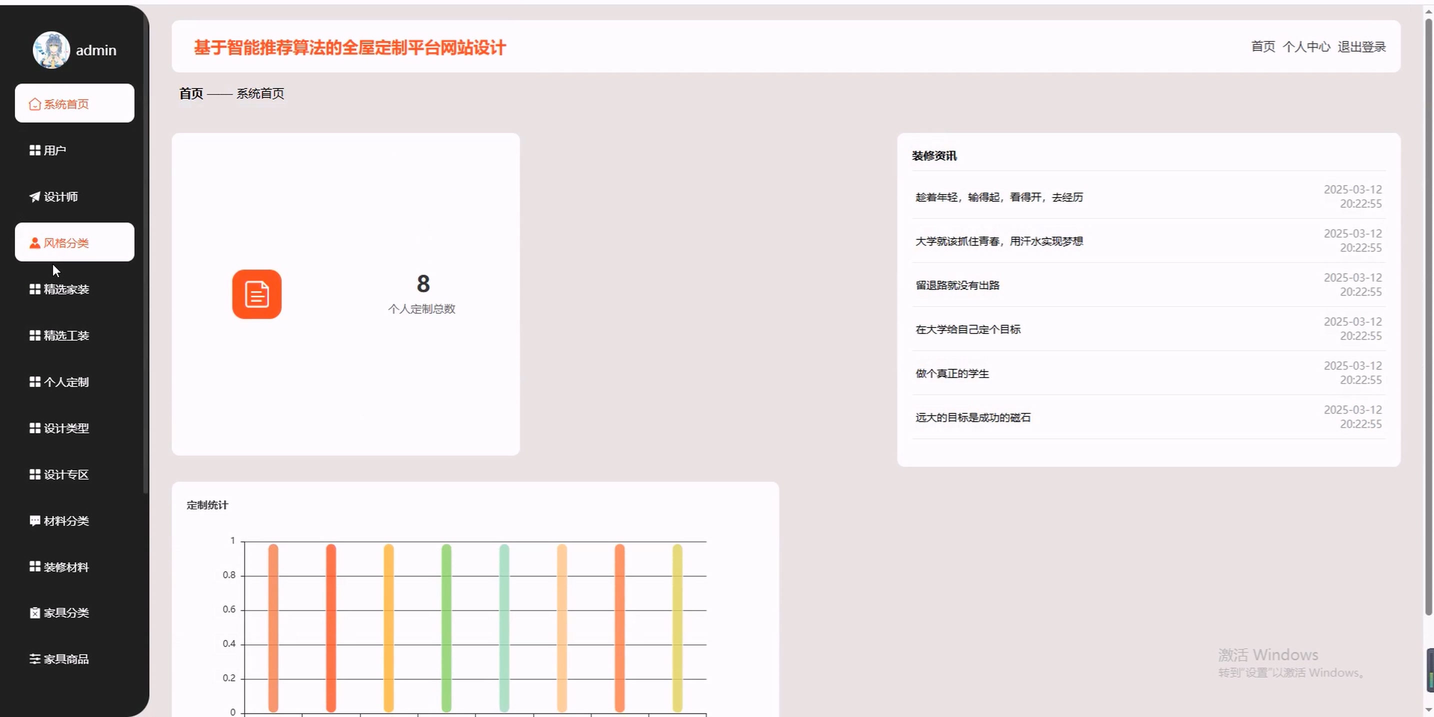 基于Python的智能推荐算法的全屋定制平台网站设计分为前台首页及后台的设计师、管理员两大模块,具体功能如下: