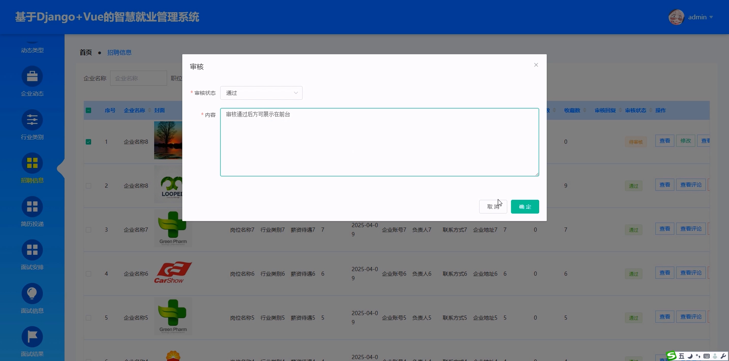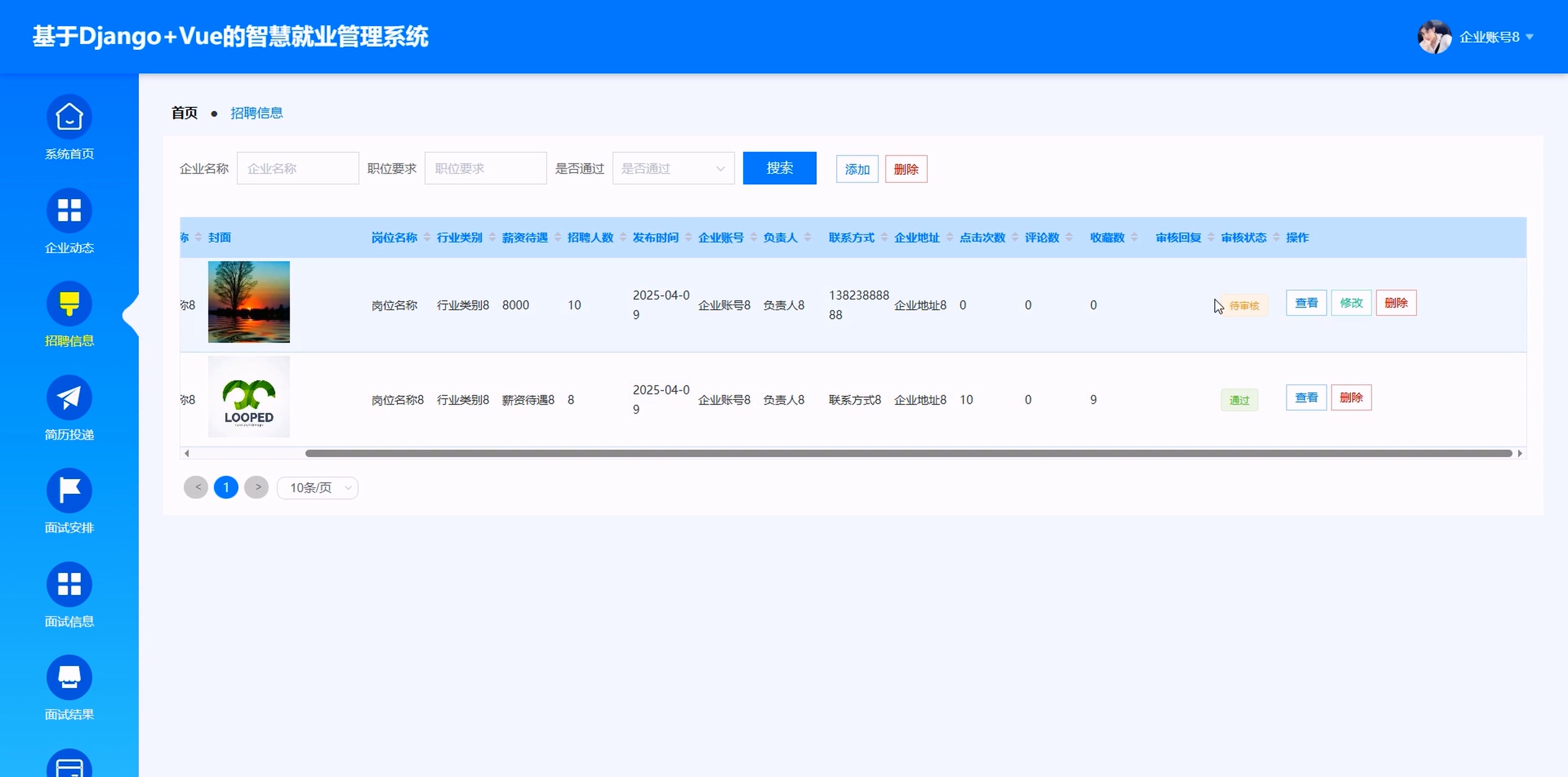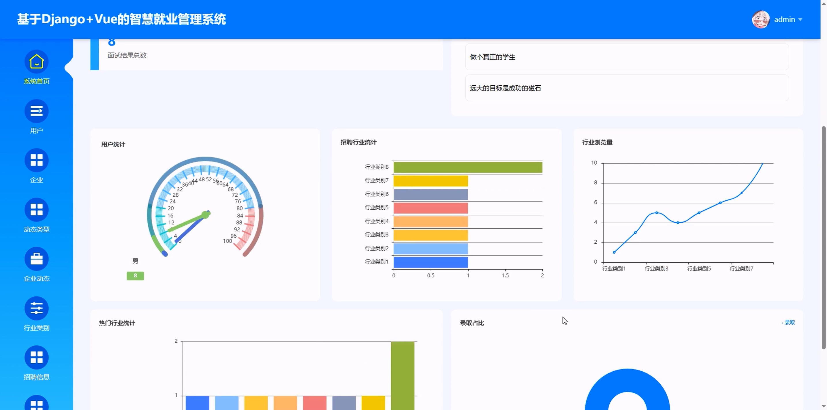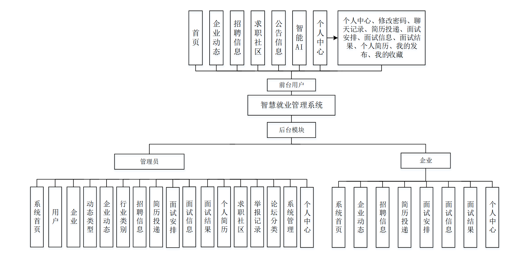 (协同算法+AI智能助手) 基于Python的智慧就业管理系统分为前台用户、后台模块(管理员、企业)两个层级,具体功能如下: