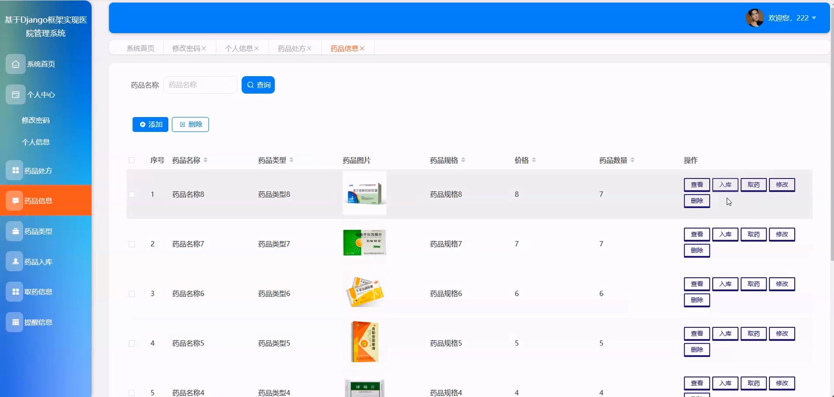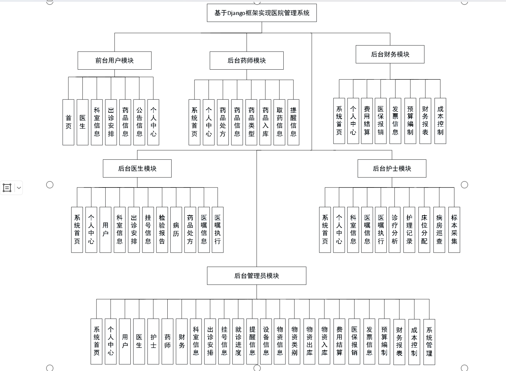 基于Python的医院管理系统分为前台用户模块及后台的医师、财务、医生、护士、管理员五大模块,具体功能如下: