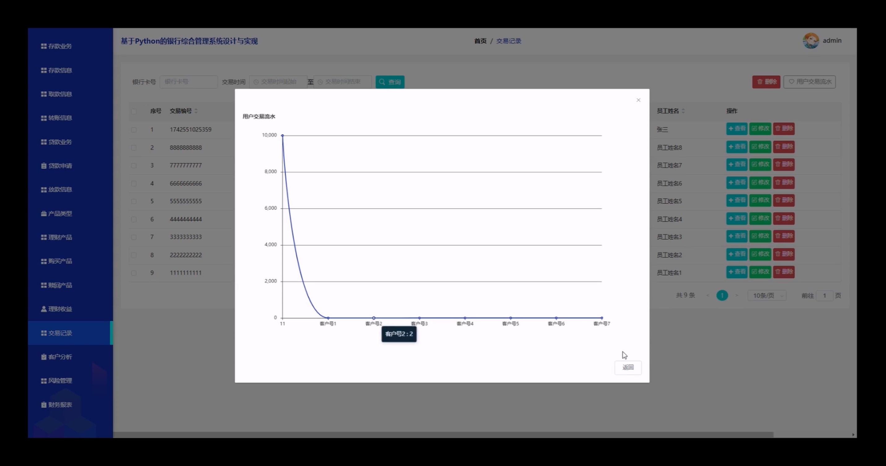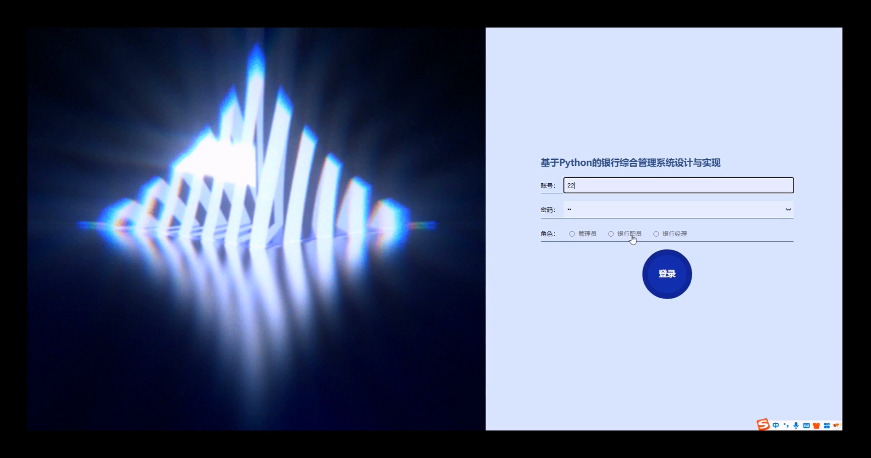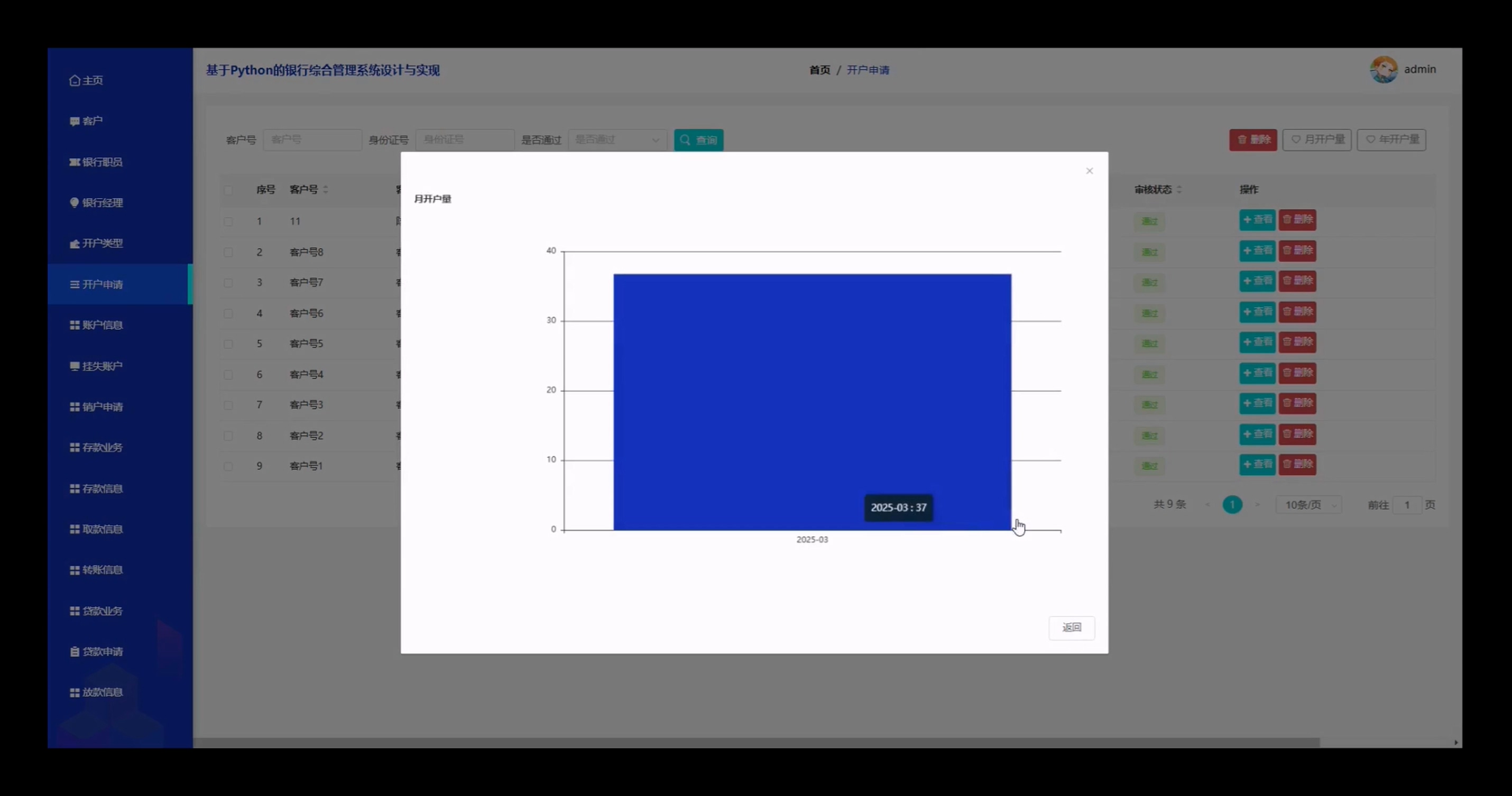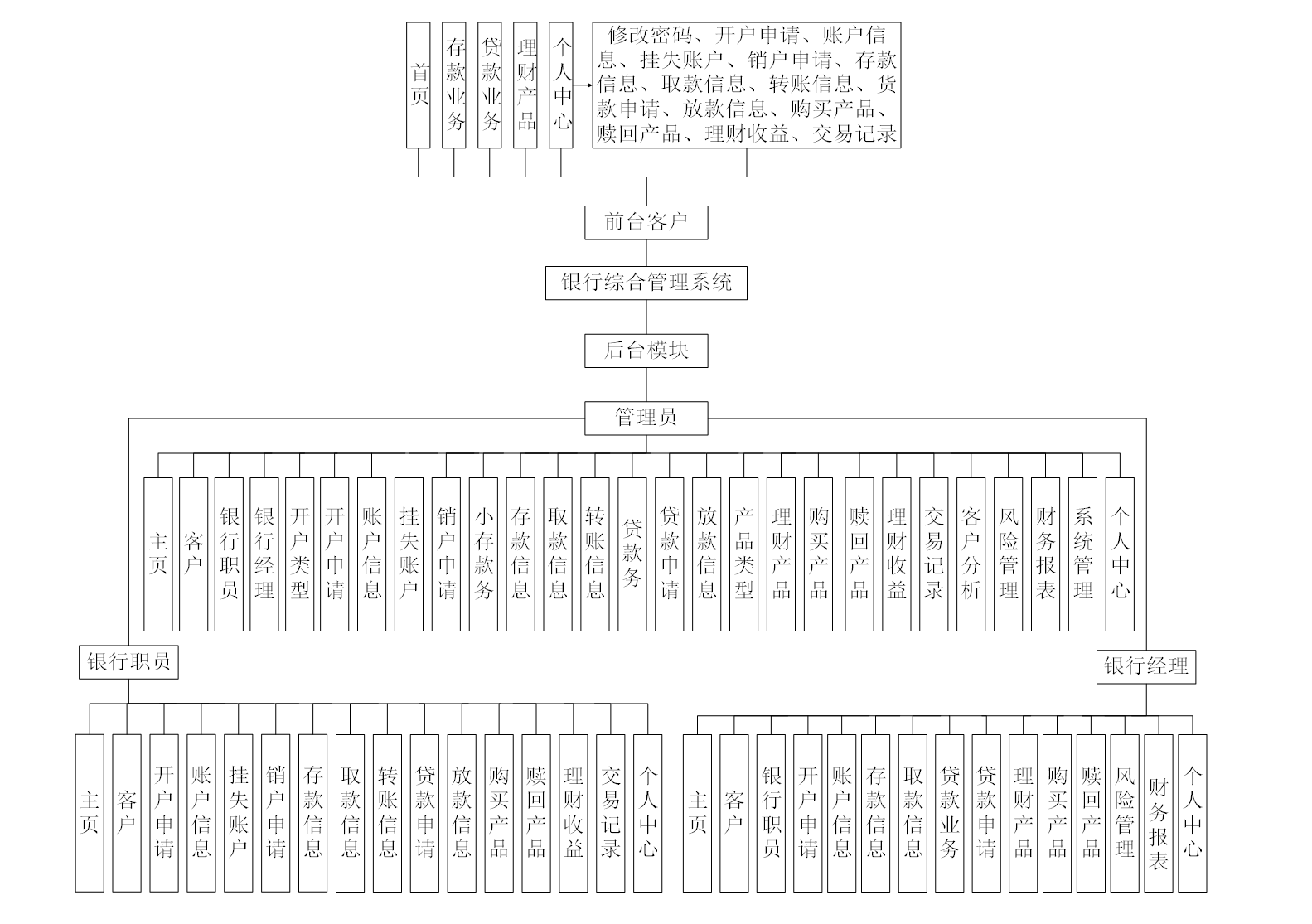 基于Python的银行综合管理系统分为前台客户、后台模块(管理员、银行员、银行经理)三个层级,具体功能如下: