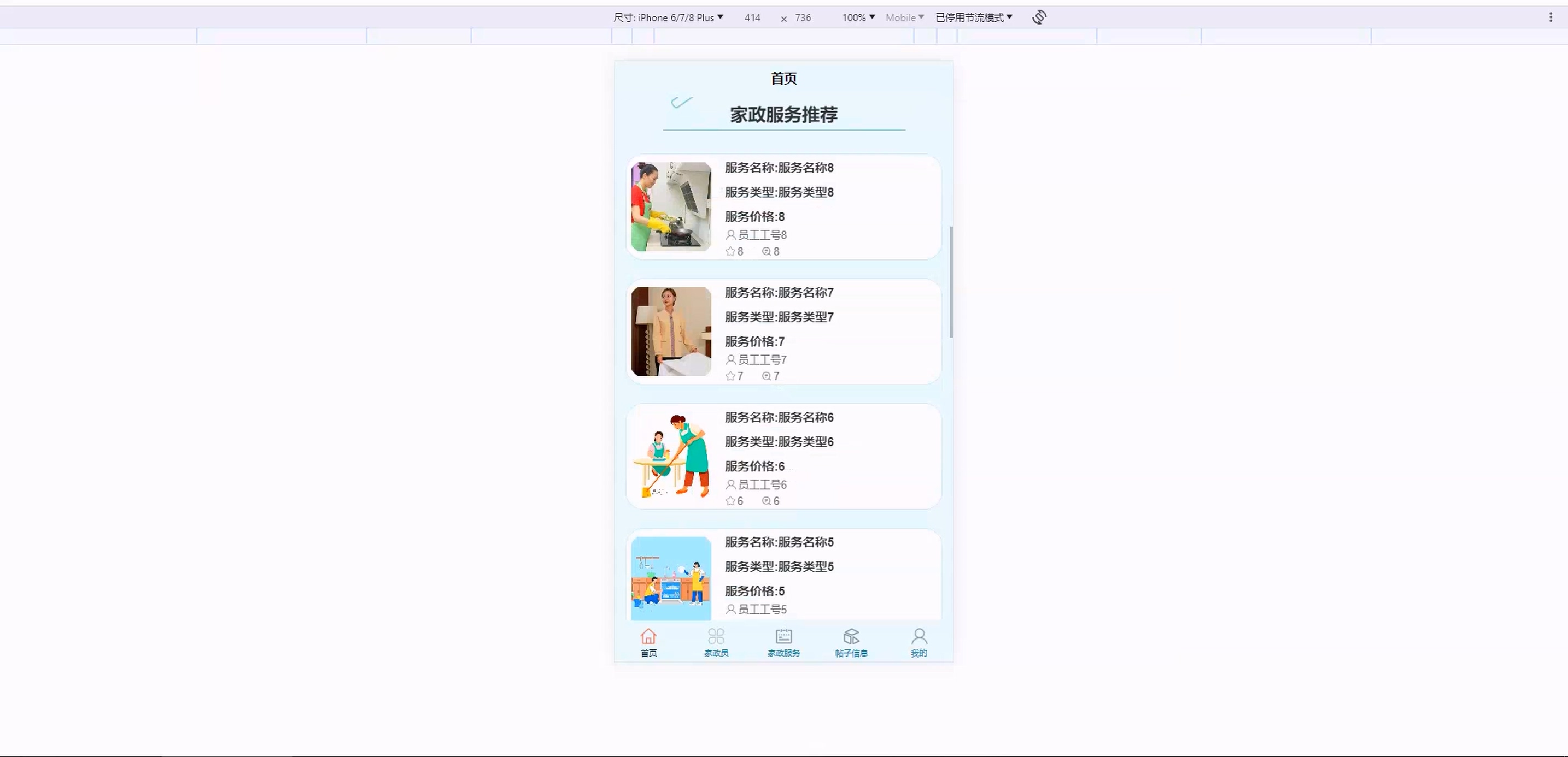 • 管理员:用户管理、家政员管理、家政服务管理、服务类型管理、服务预约管理、订单提醒管理、服务记录管理、服务评价管理、帖子信息管理、帖子类型管理、系统管理、个人中心
