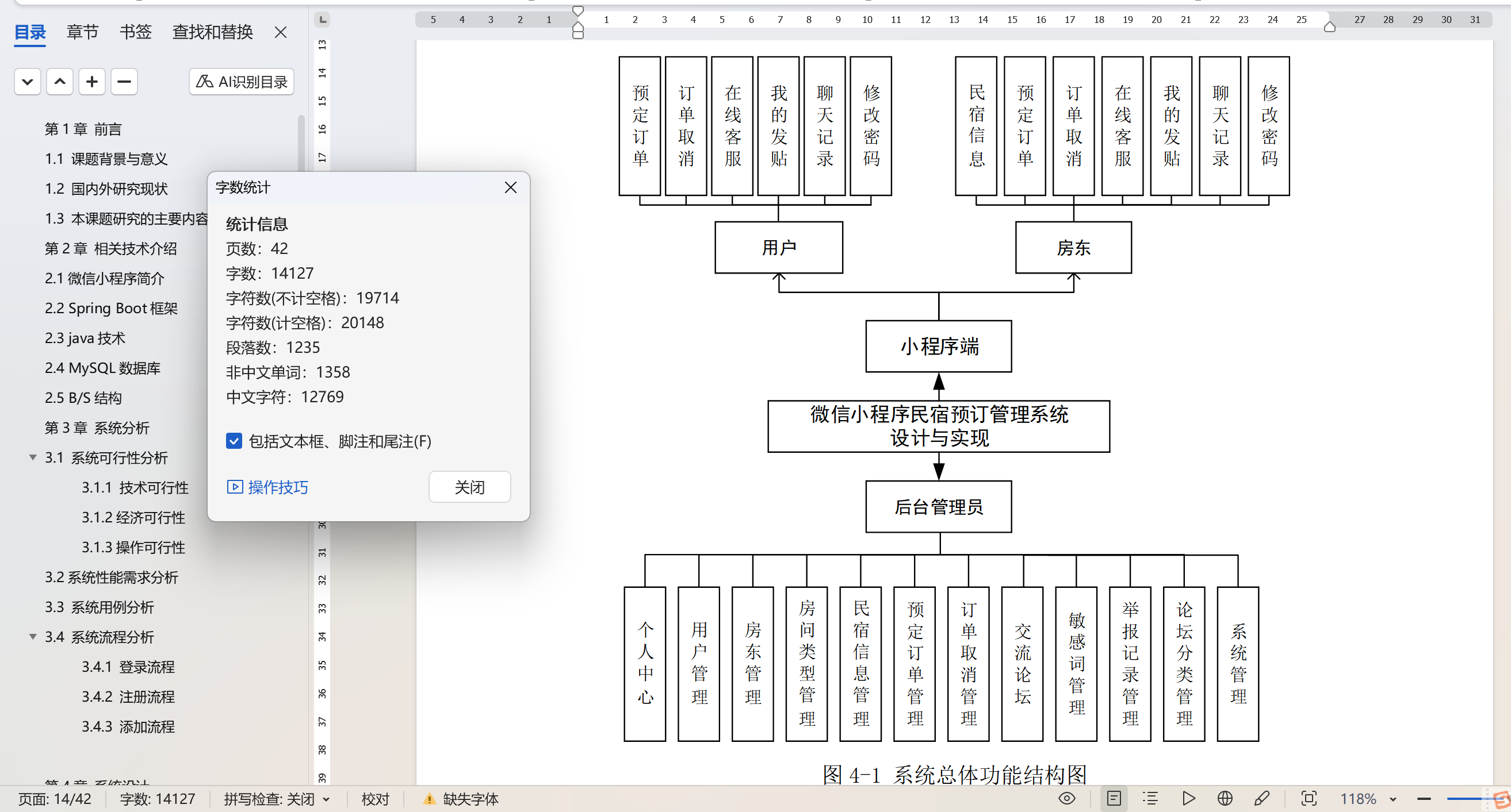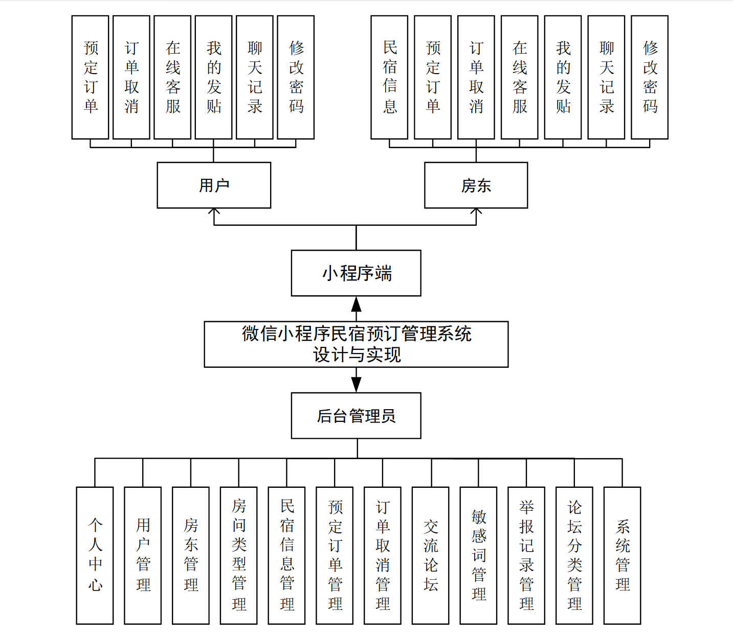基于微信小程序的民宿预订管理系统分为小程序端(用户、房东)、后台管理员两个层级,具体功能如下: