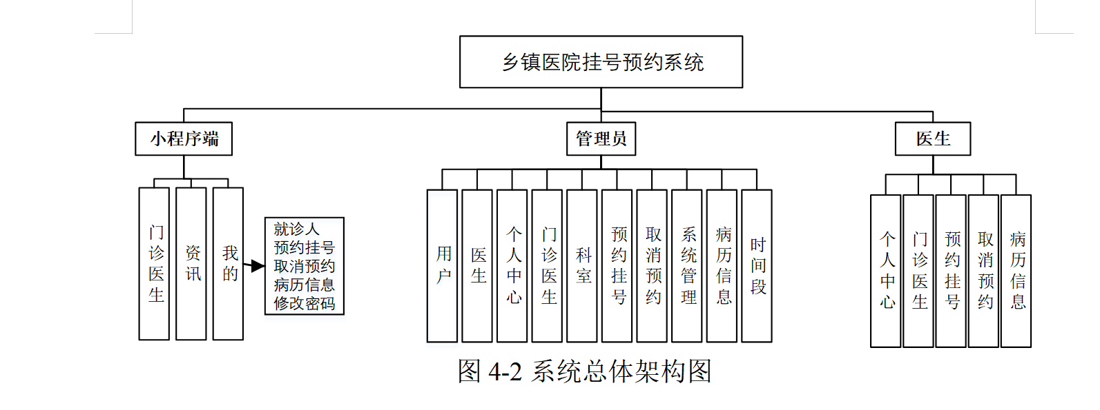 基于微信小程序的乡镇医院挂号预约系统分为小程序端、管理员、医生三个角色模块,功能如下: