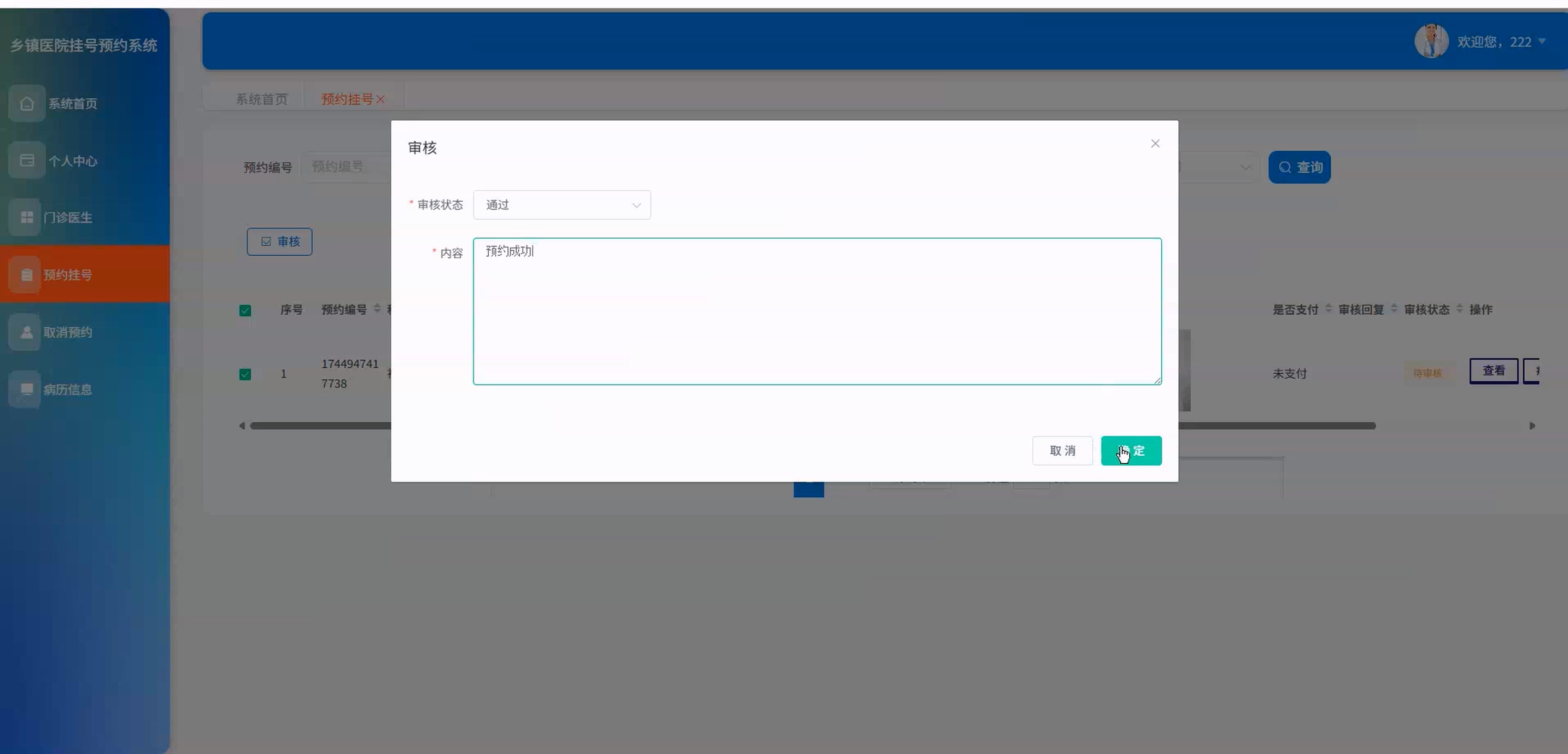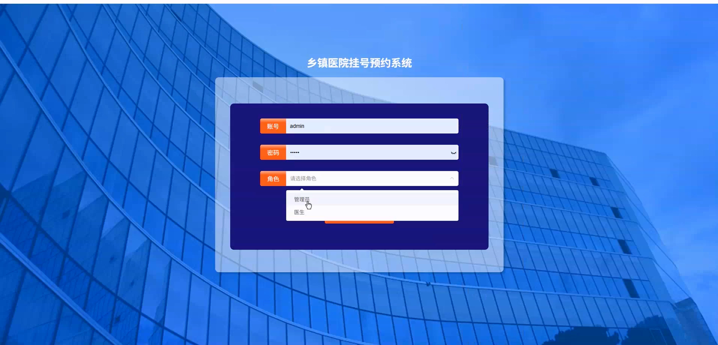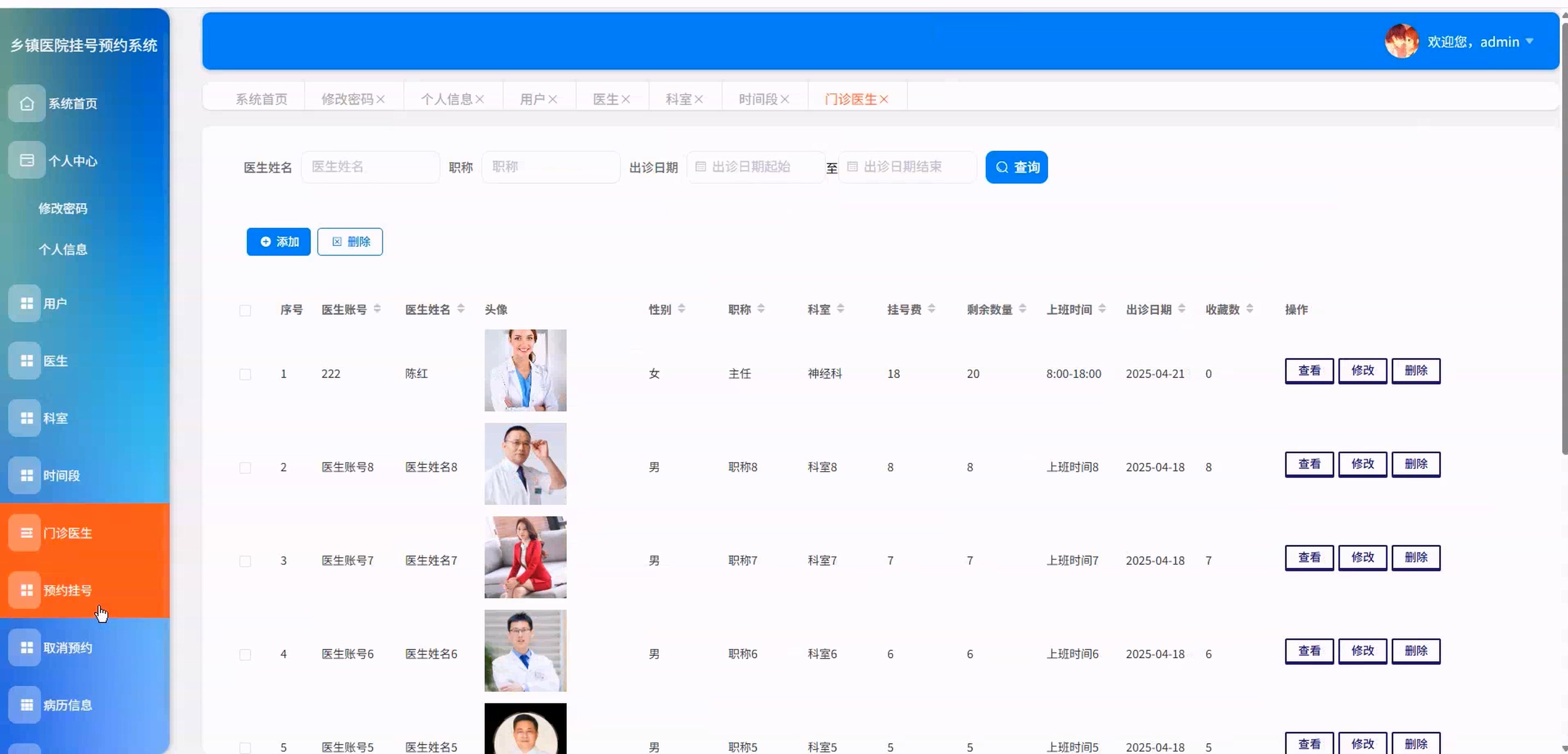 (2)管理员:用户、医生、个人中心、门诊医生、科室、预约挂号、取消预约、系统管理、病历信息、时间阶段