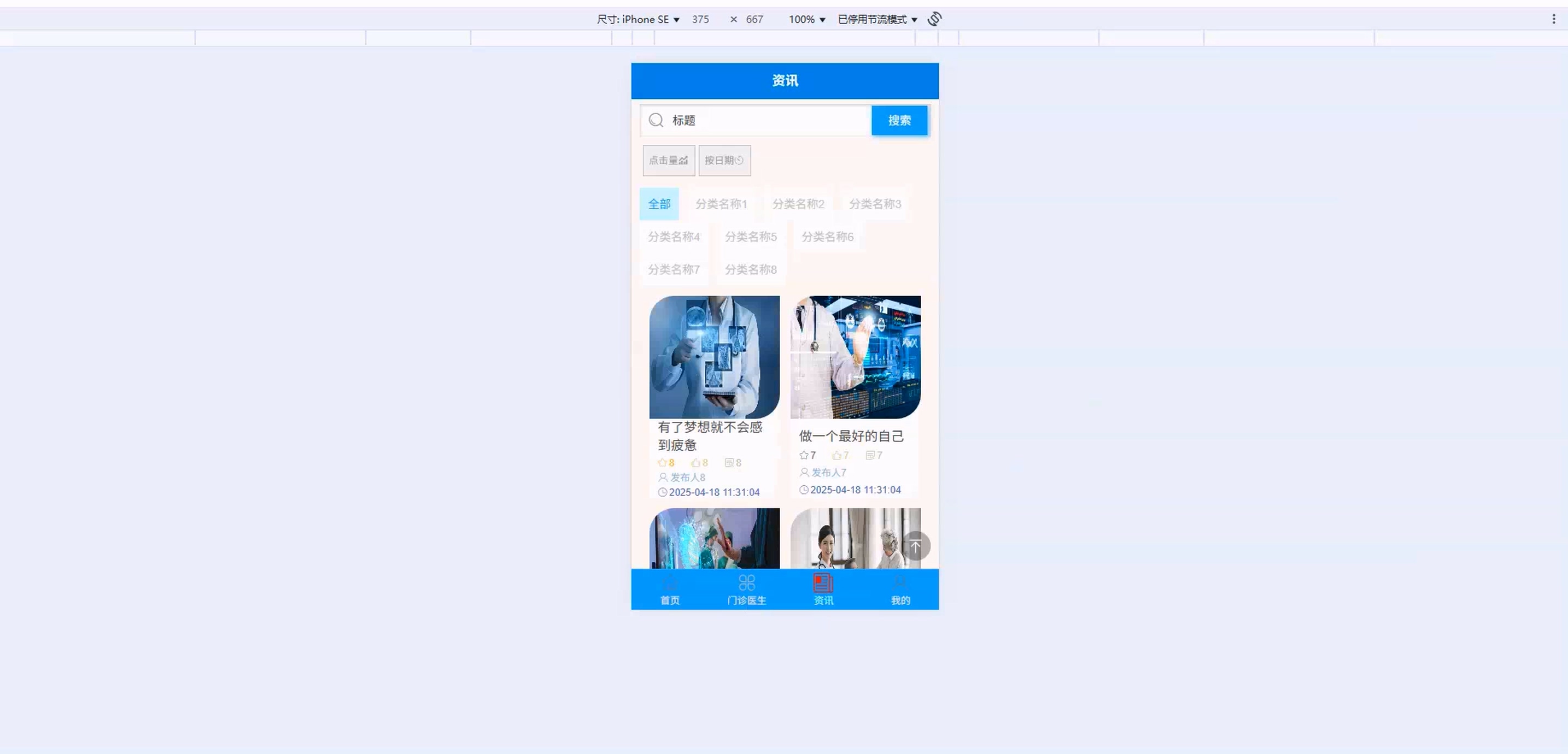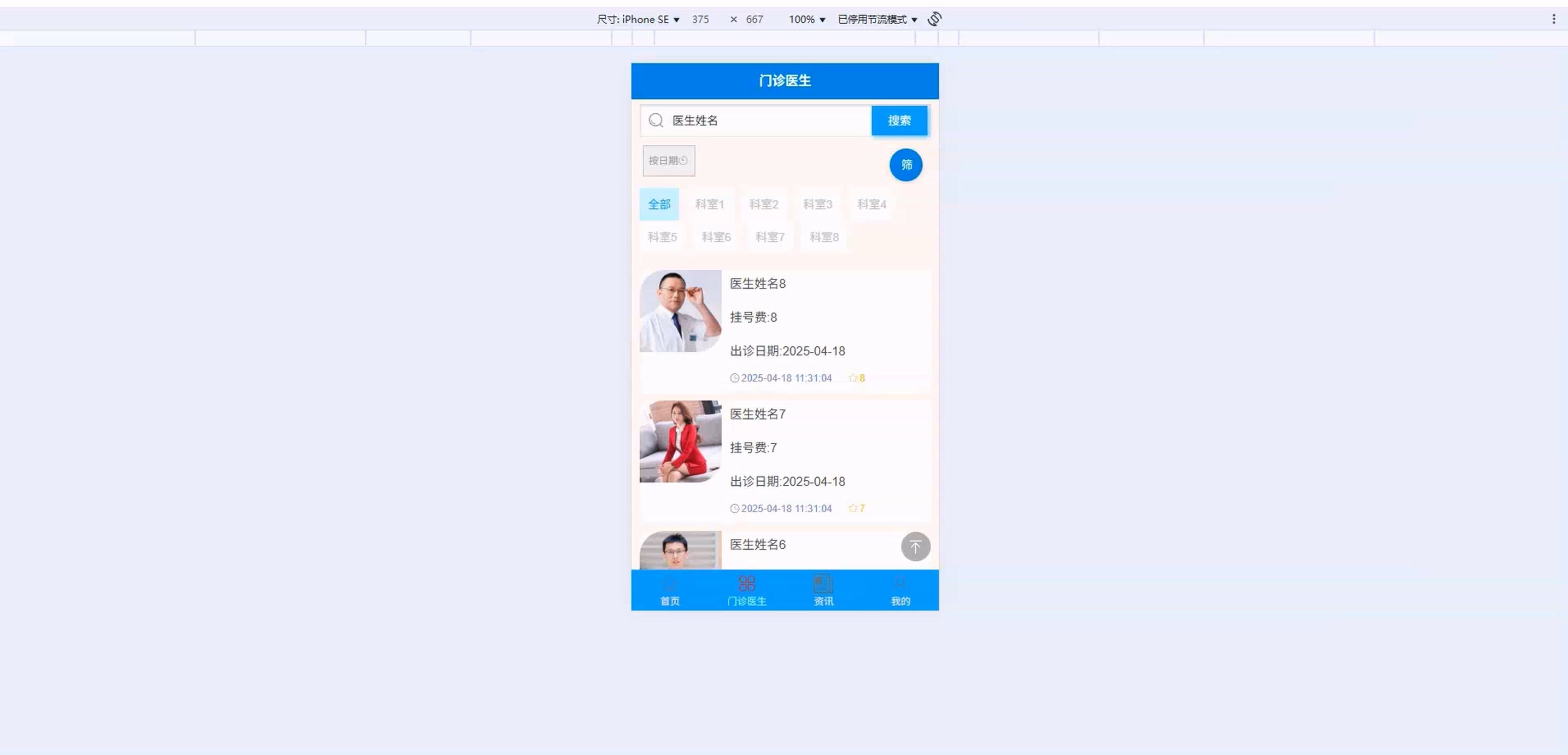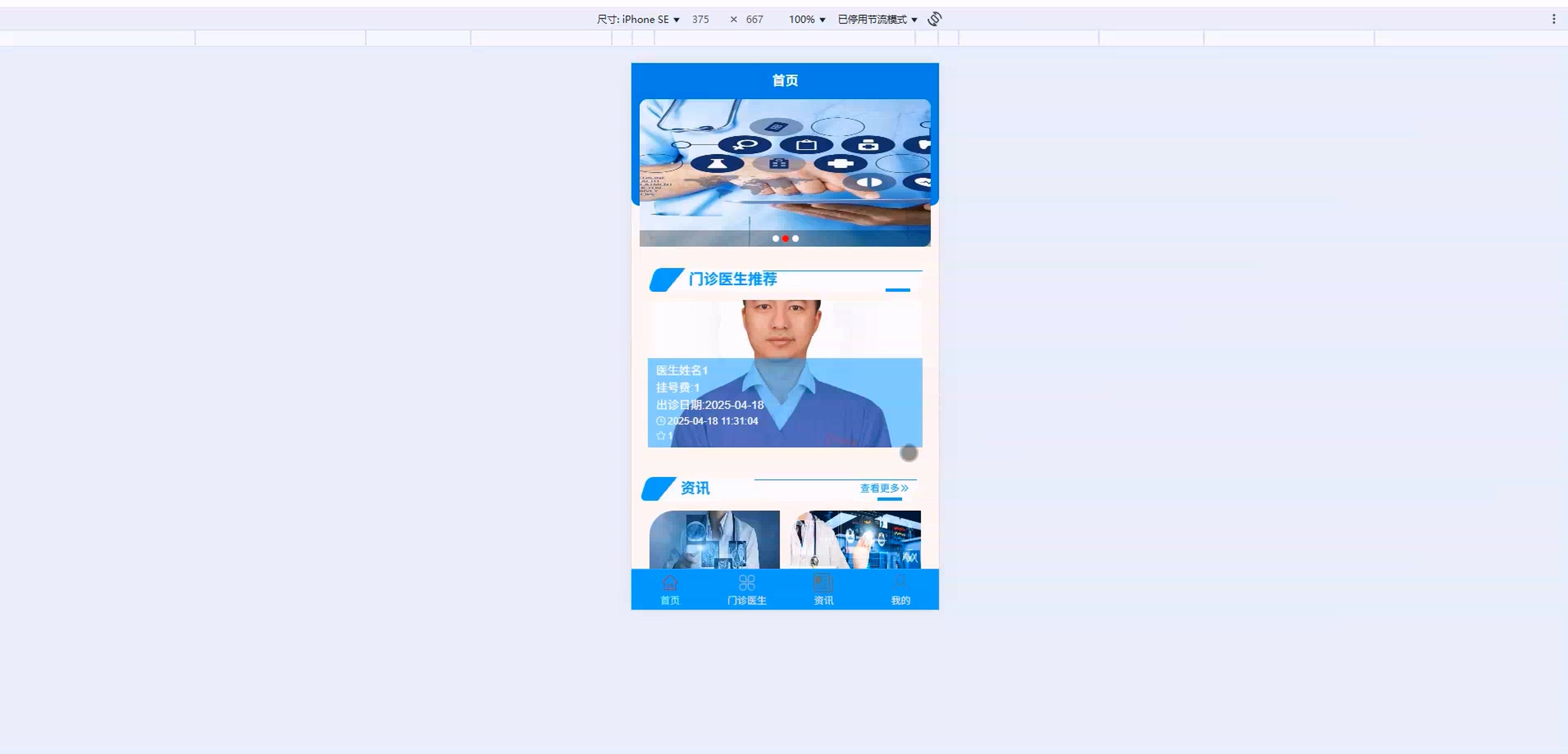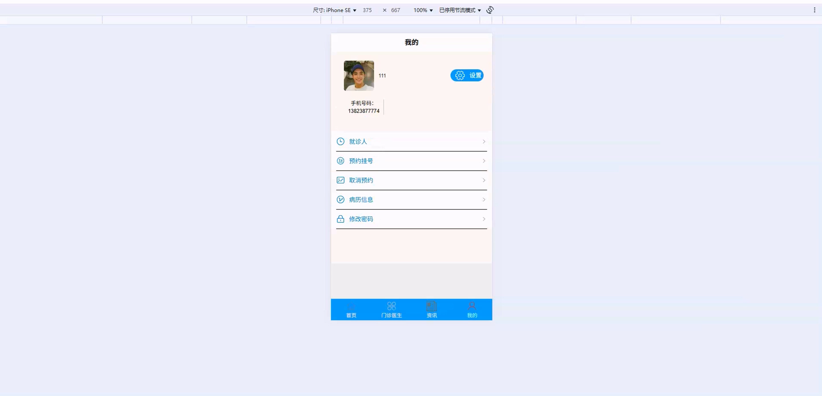 (1)小程序端:门诊医生、资讯、我的(含就诊人管理、预约挂号、取消预约、修改密码)