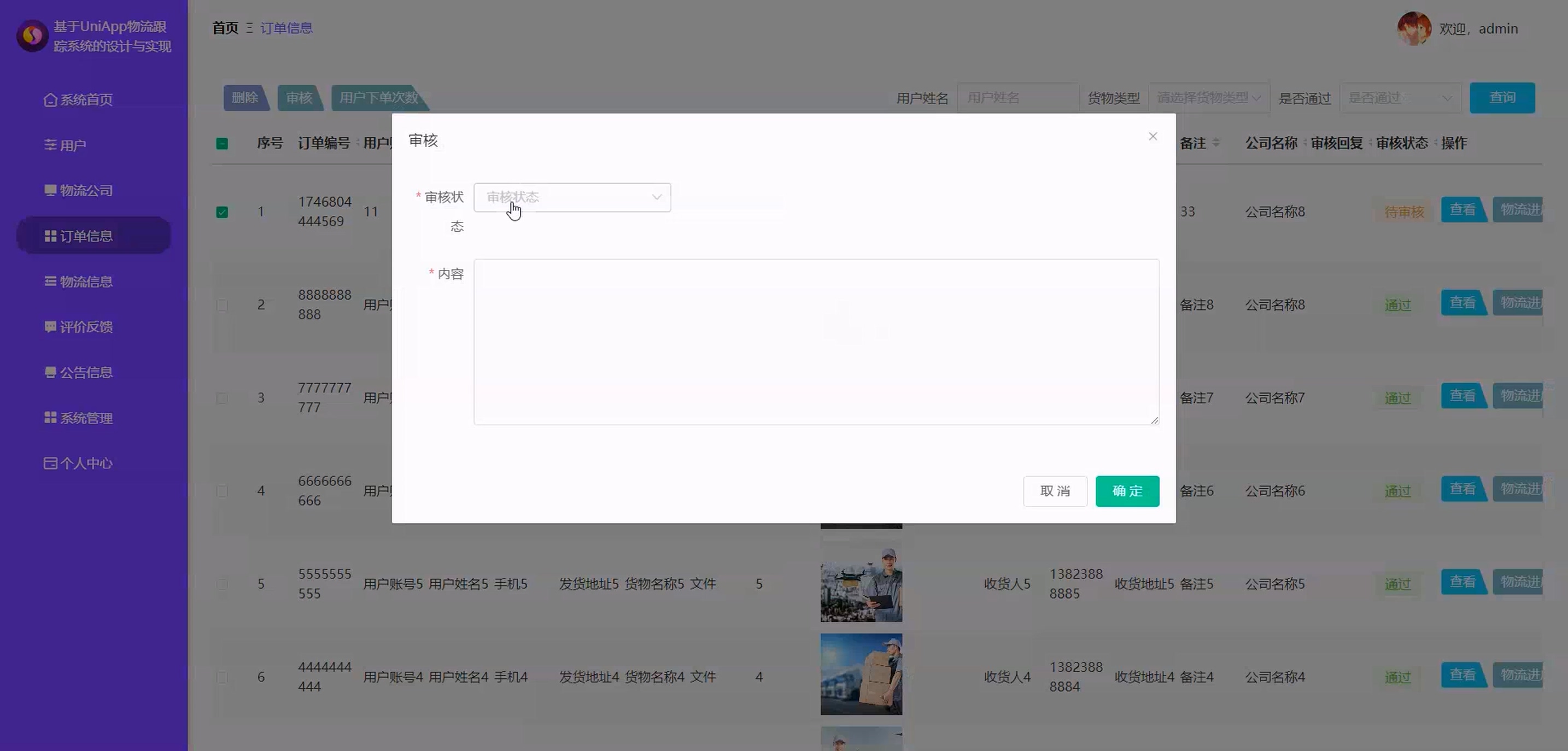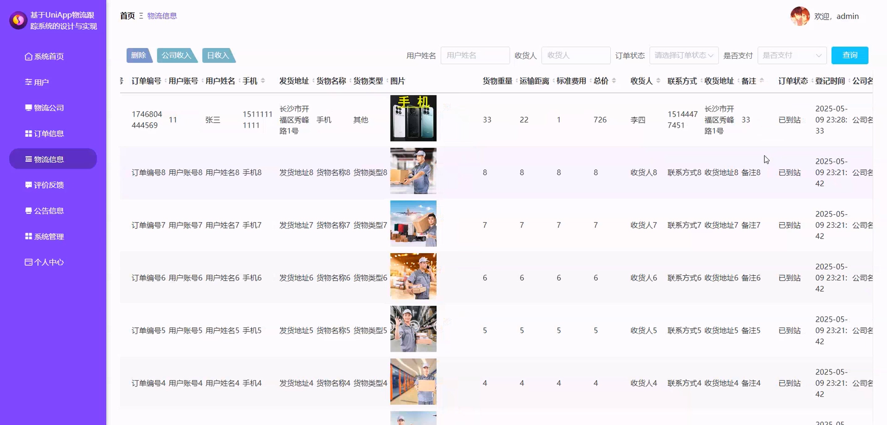 (1)后台管理员模块:系统首页、用户、物流公司、订单信息、物流信息、评价反馈、公告信息、系统管理、个人中心