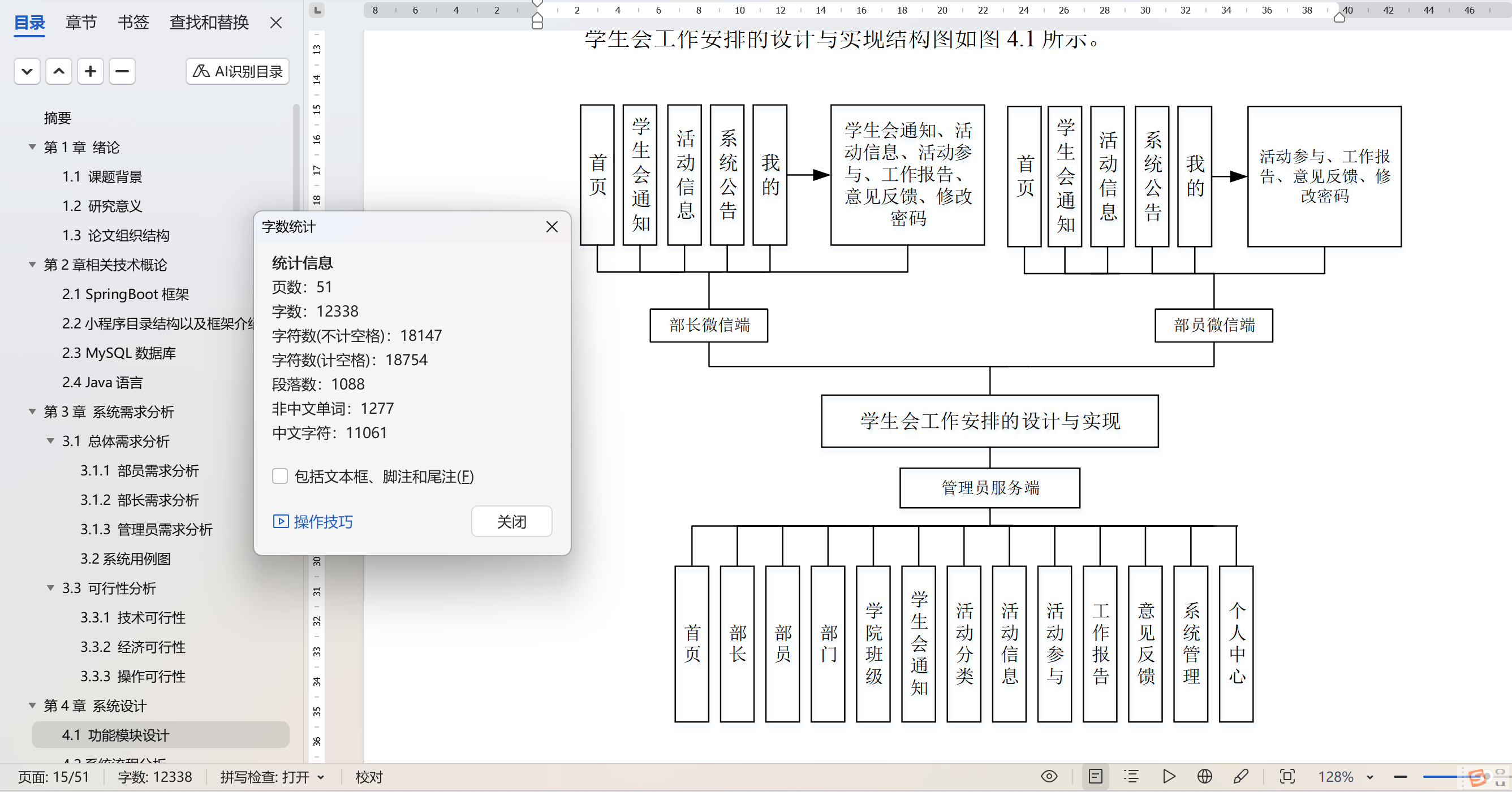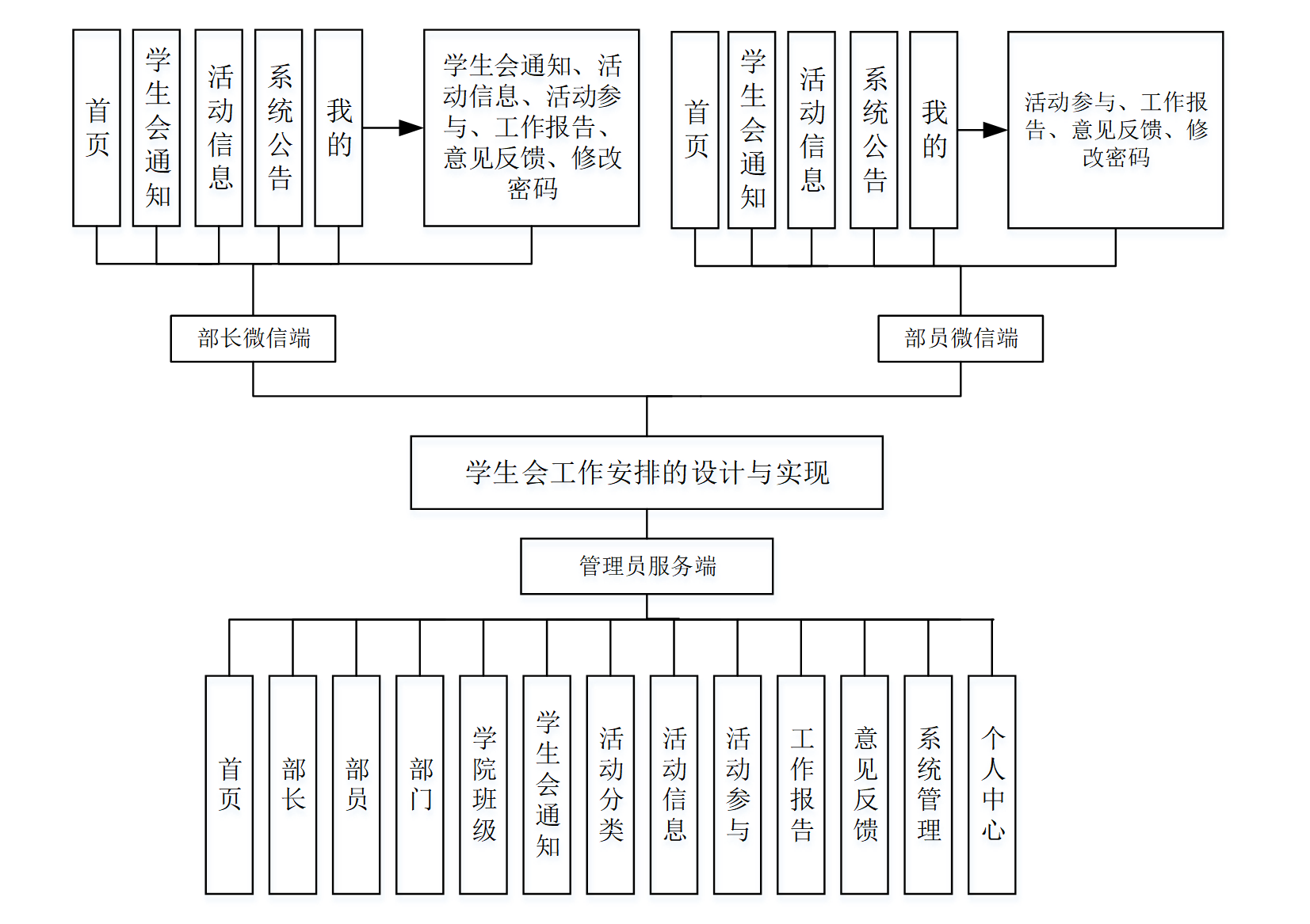 基于微信小程序的学生会工作安排系统分为部长微信端、部员微信端、管理员服务端三个层级,具体功能如下: