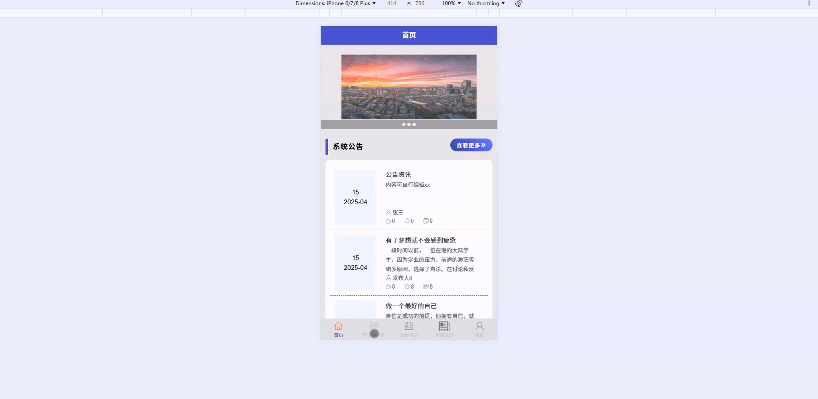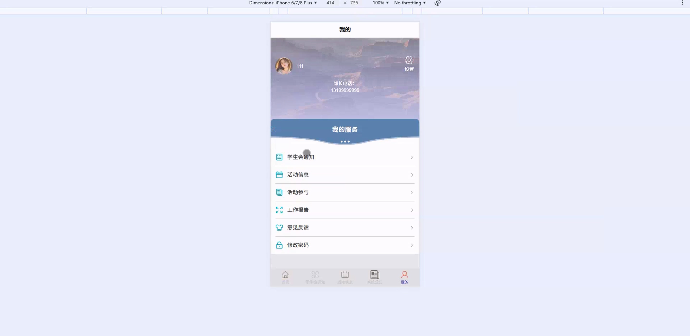 (2) 部员微信端:首页、学生会通知、活动信息、系统公告、我的(含活动参与、工作报告、意见反馈、修改密码)