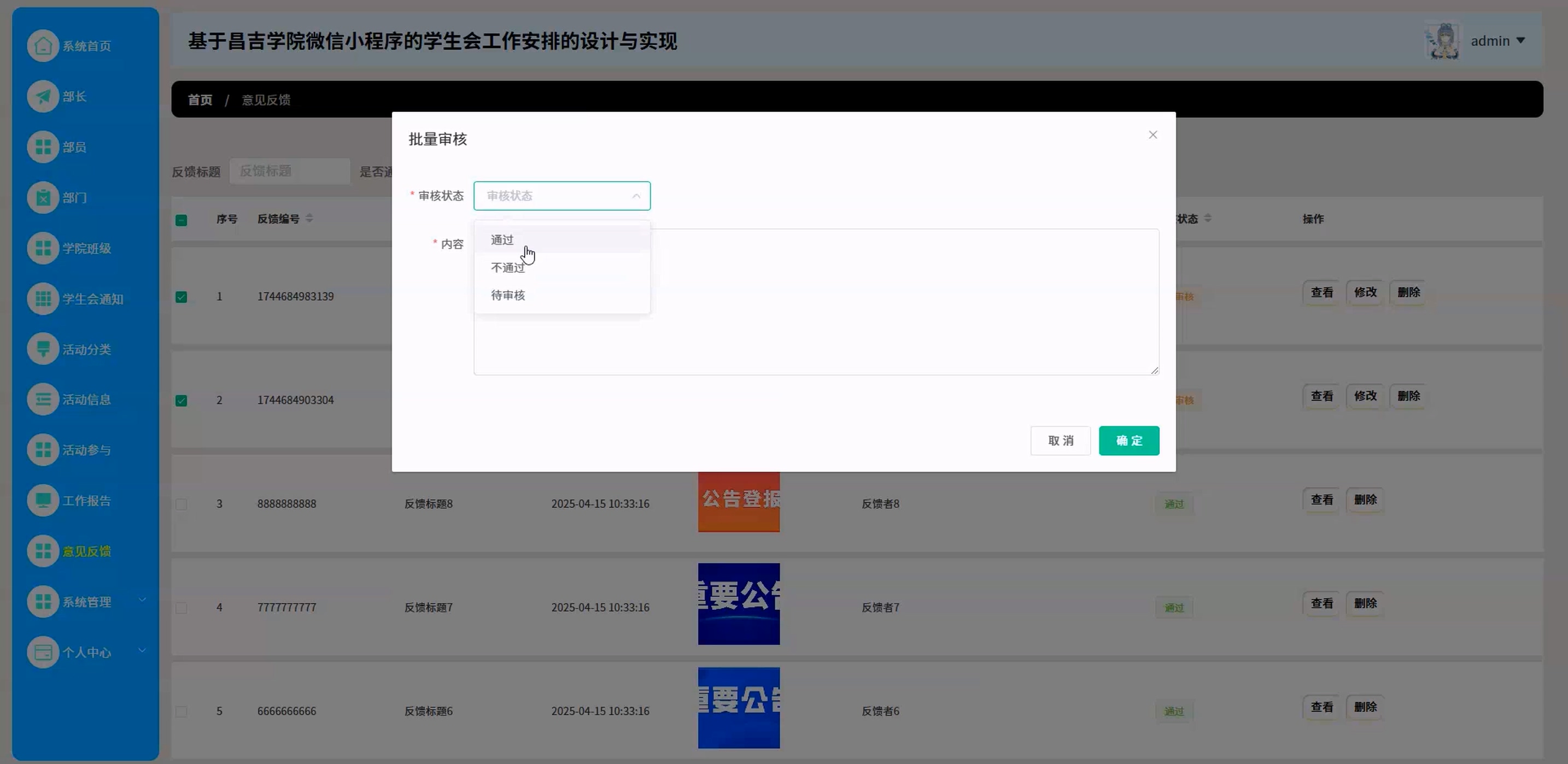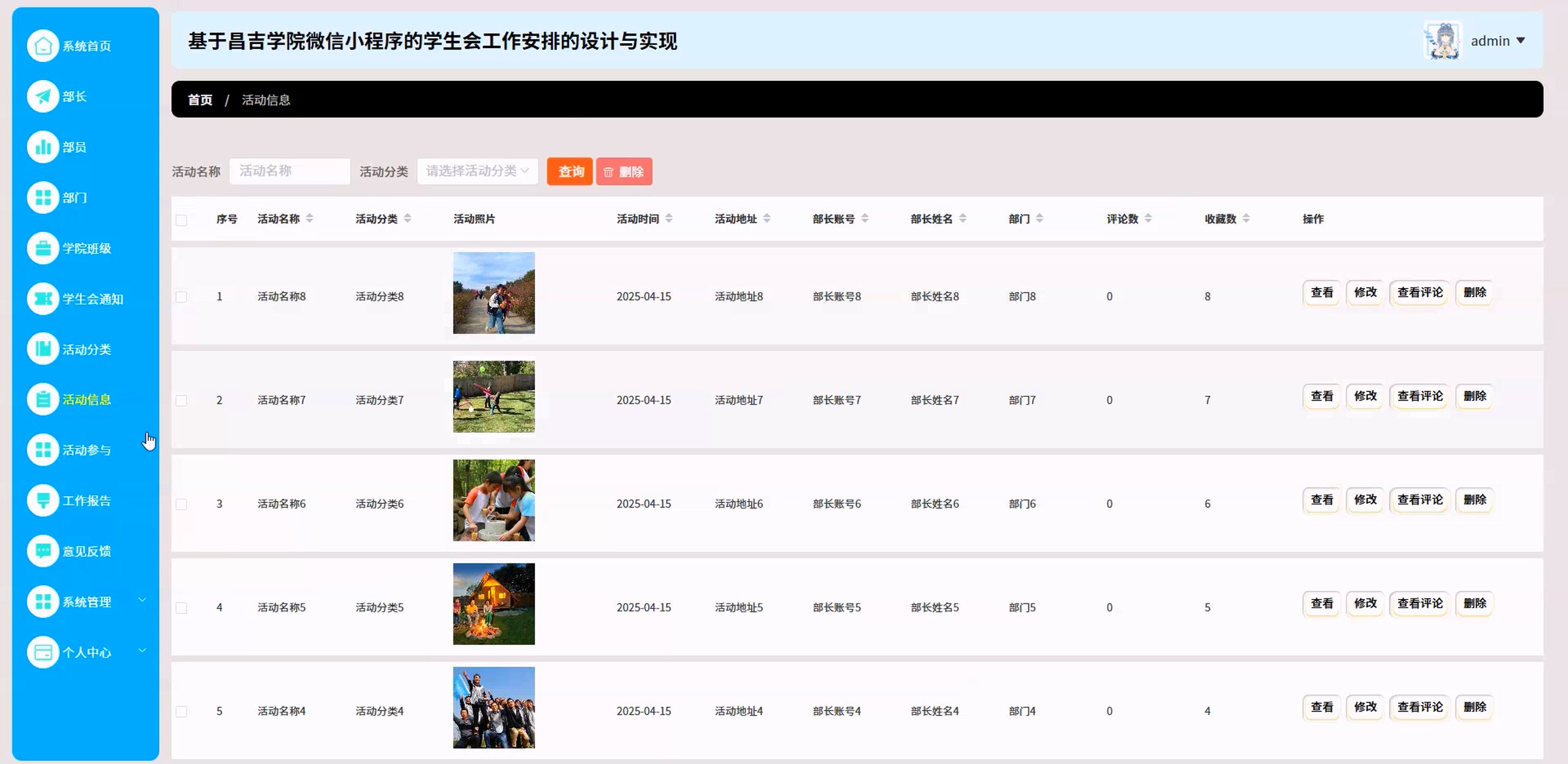 (3) 管理员服务端:首页、部长、部员、部门、学院班级、学生会通知、活动分类、活动信息、活动参与、工作报告、意见反馈、系统管理、个人中心