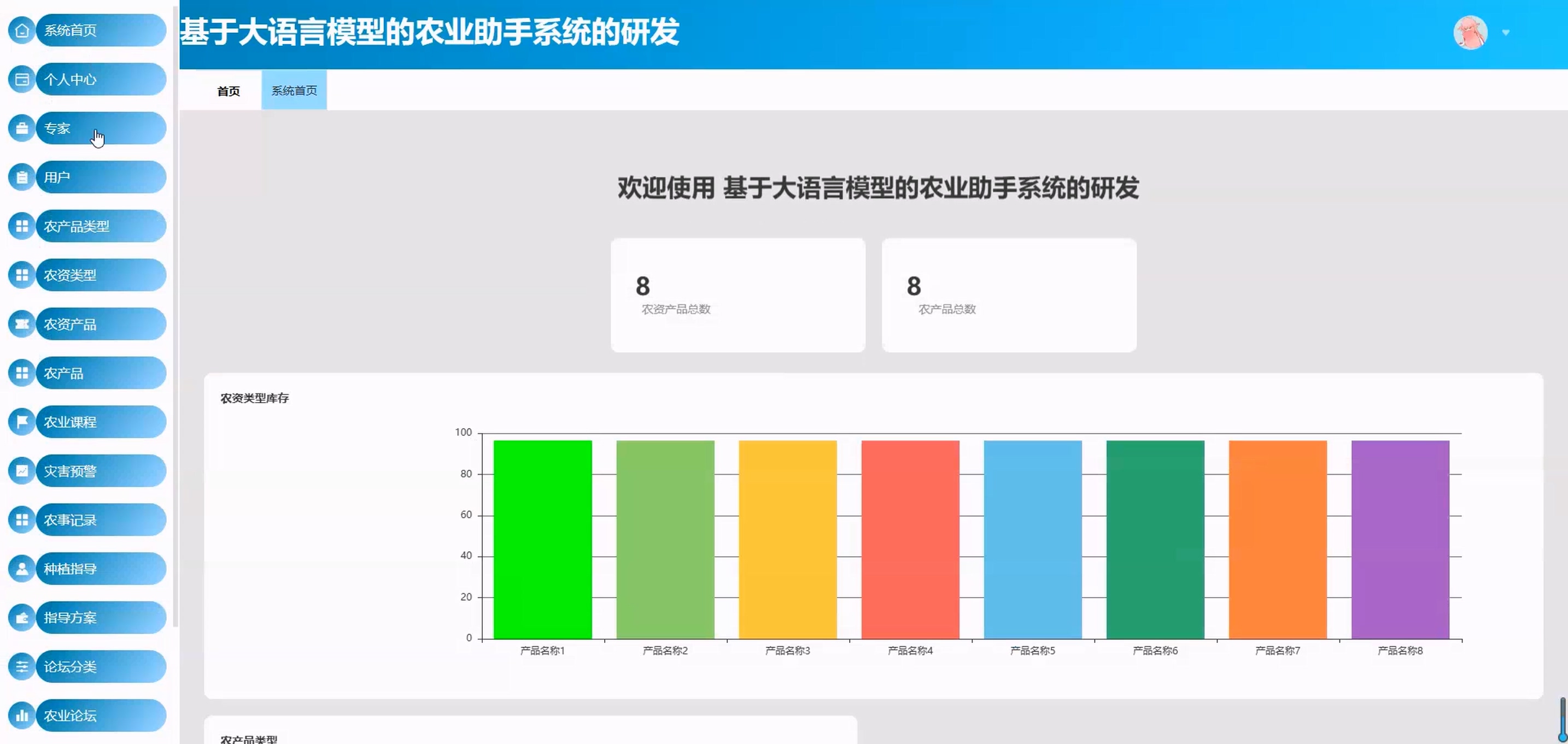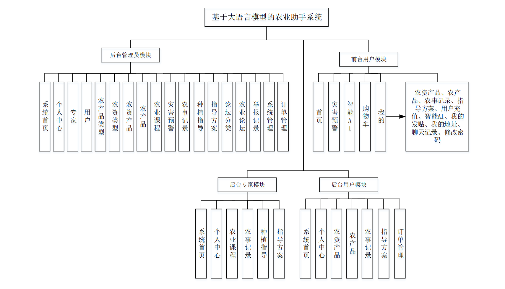 (协同过滤推荐算法+AI智能助手)基于微信小程序的农业助手系统分为后台管理模块、前台用户模块、后台专家模块、后台用户模块四个层级,具体功能如下: