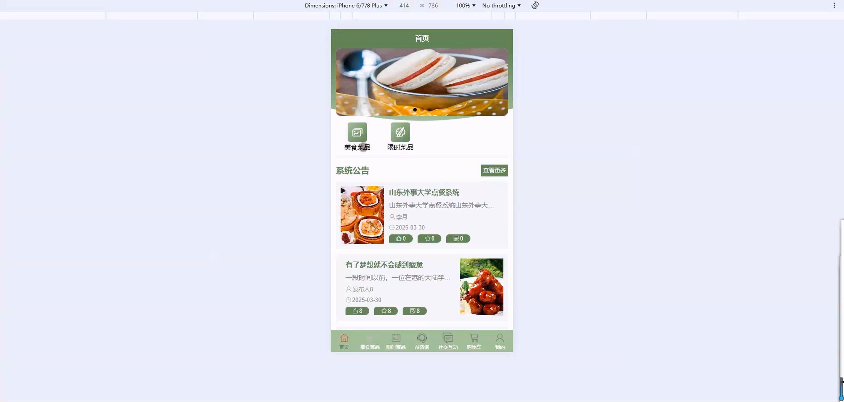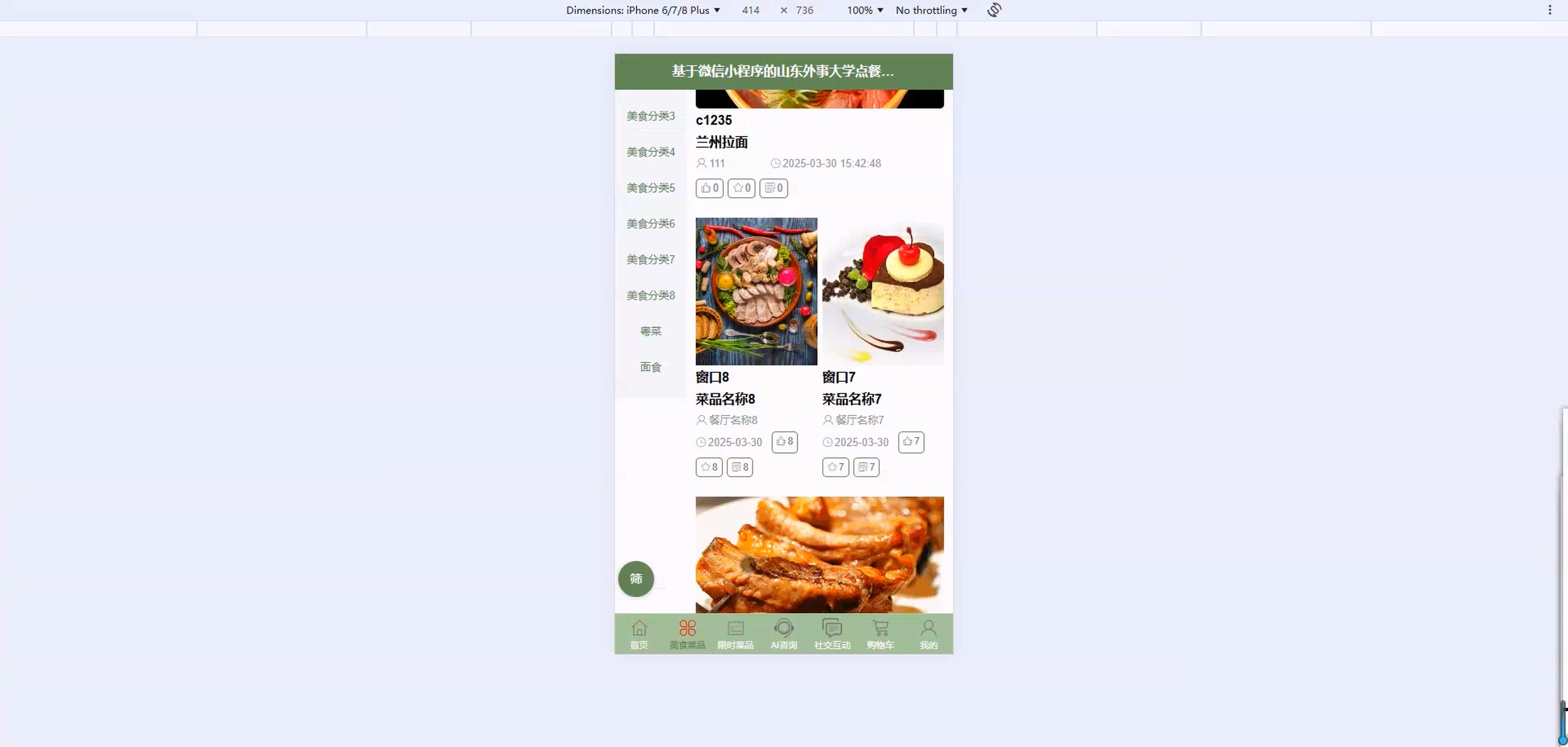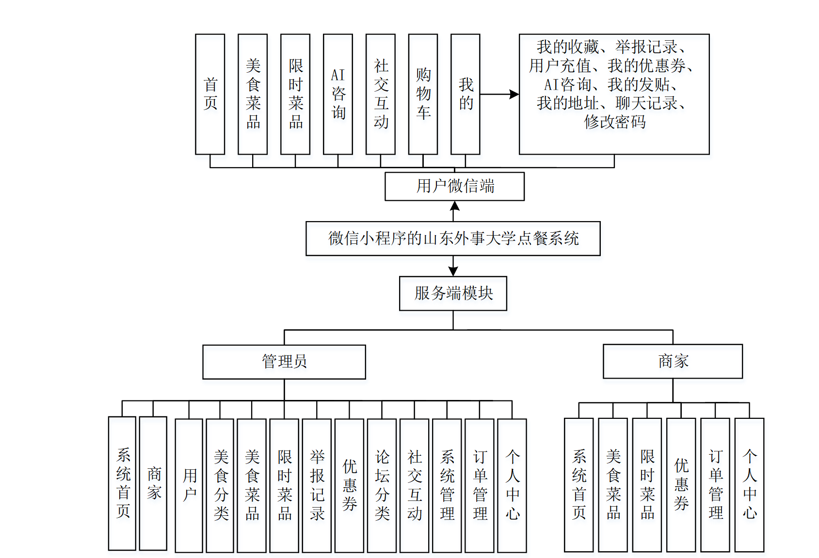 (1) 用户微信端:首页、美食菜品、限时菜品、AI 咨询、社交互动、购物车、我的(含我的收藏、举报记录、用户充值、我的优惠券、AI 咨询、我的发帖、我的地址、聊天记录、修改密码)