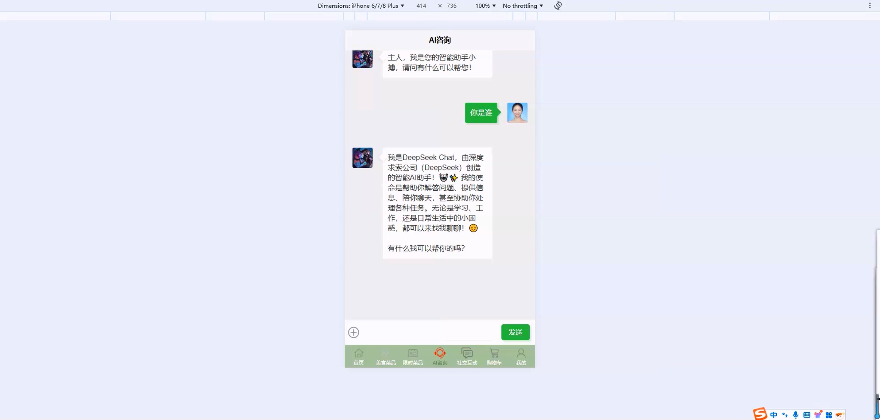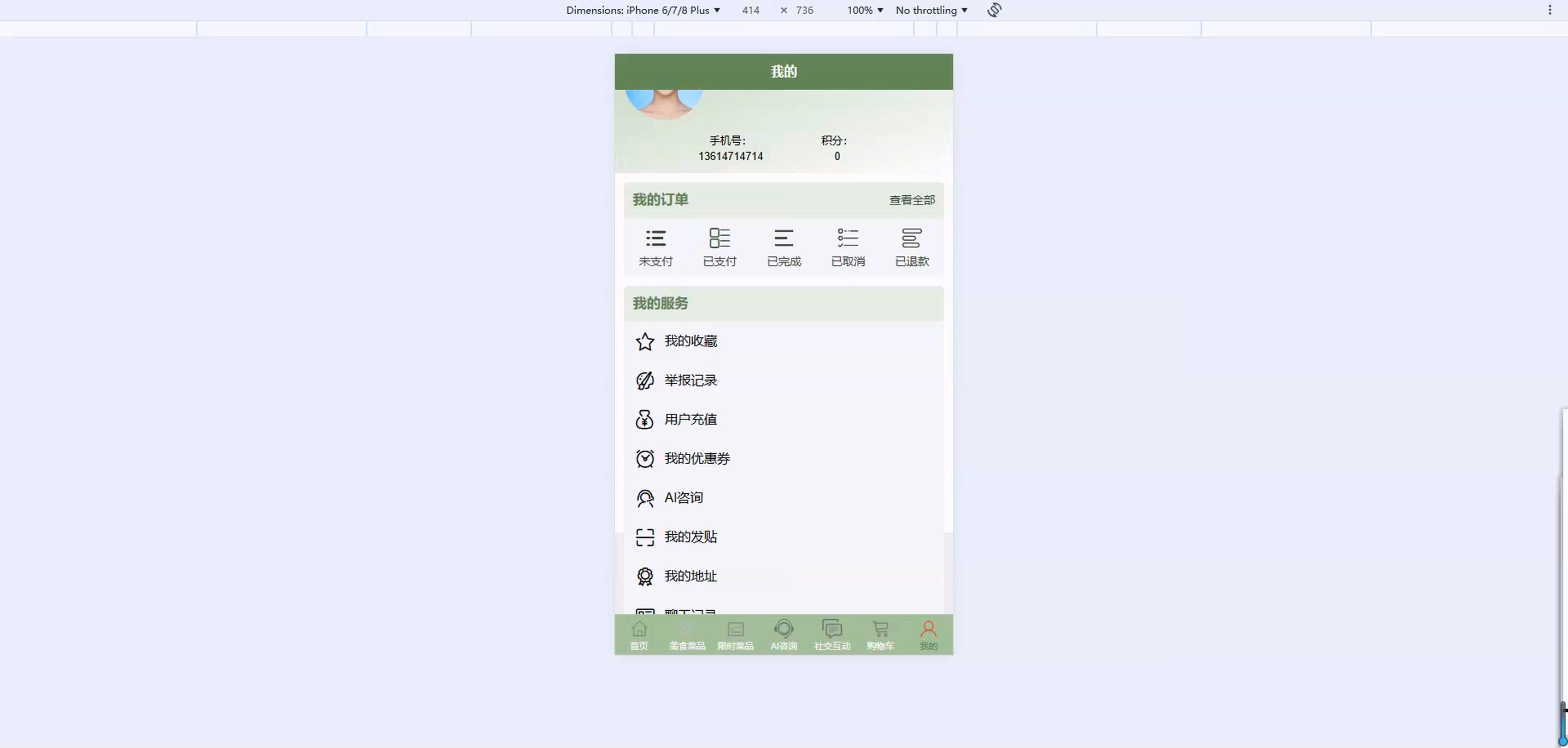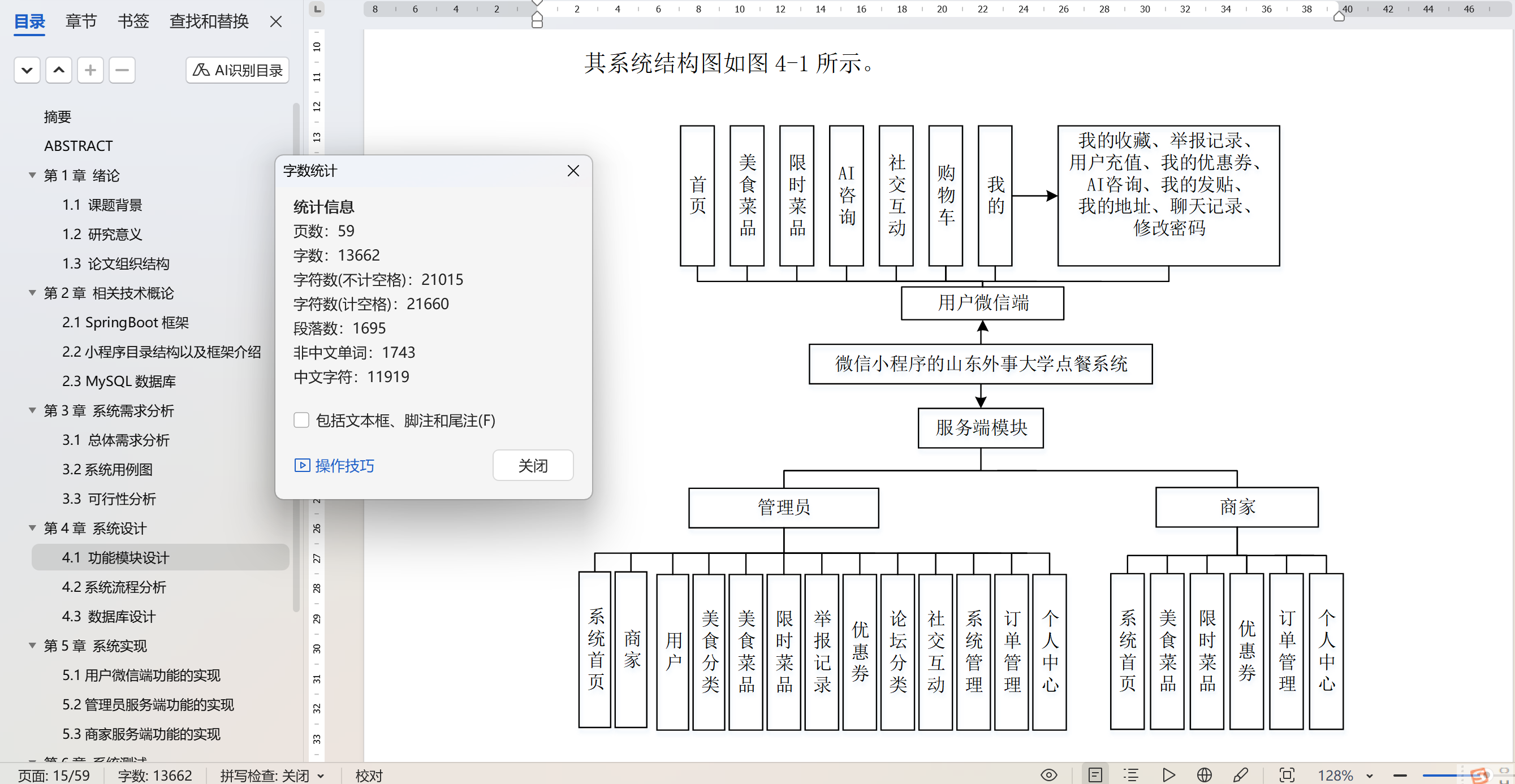 (1) 用户微信端:首页、美食菜品、限时菜品、AI 咨询、社交互动、购物车、我的(含我的收藏、举报记录、用户充值、我的优惠券、AI 咨询、我的发帖、我的地址、聊天记录、修改密码)