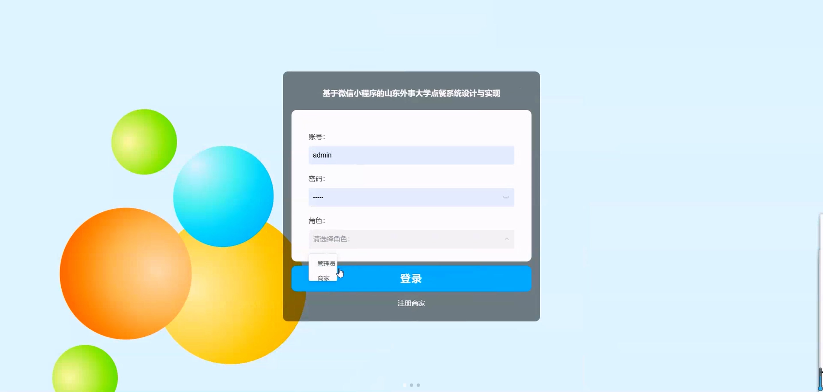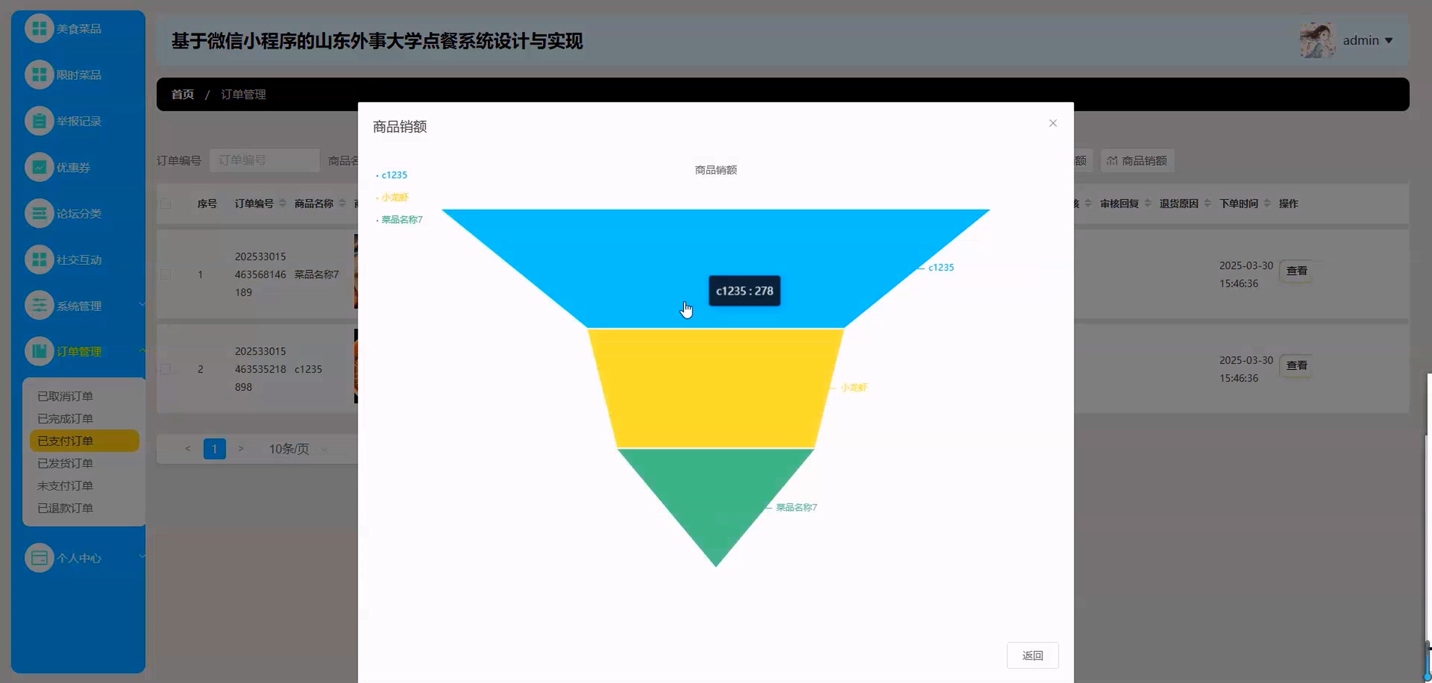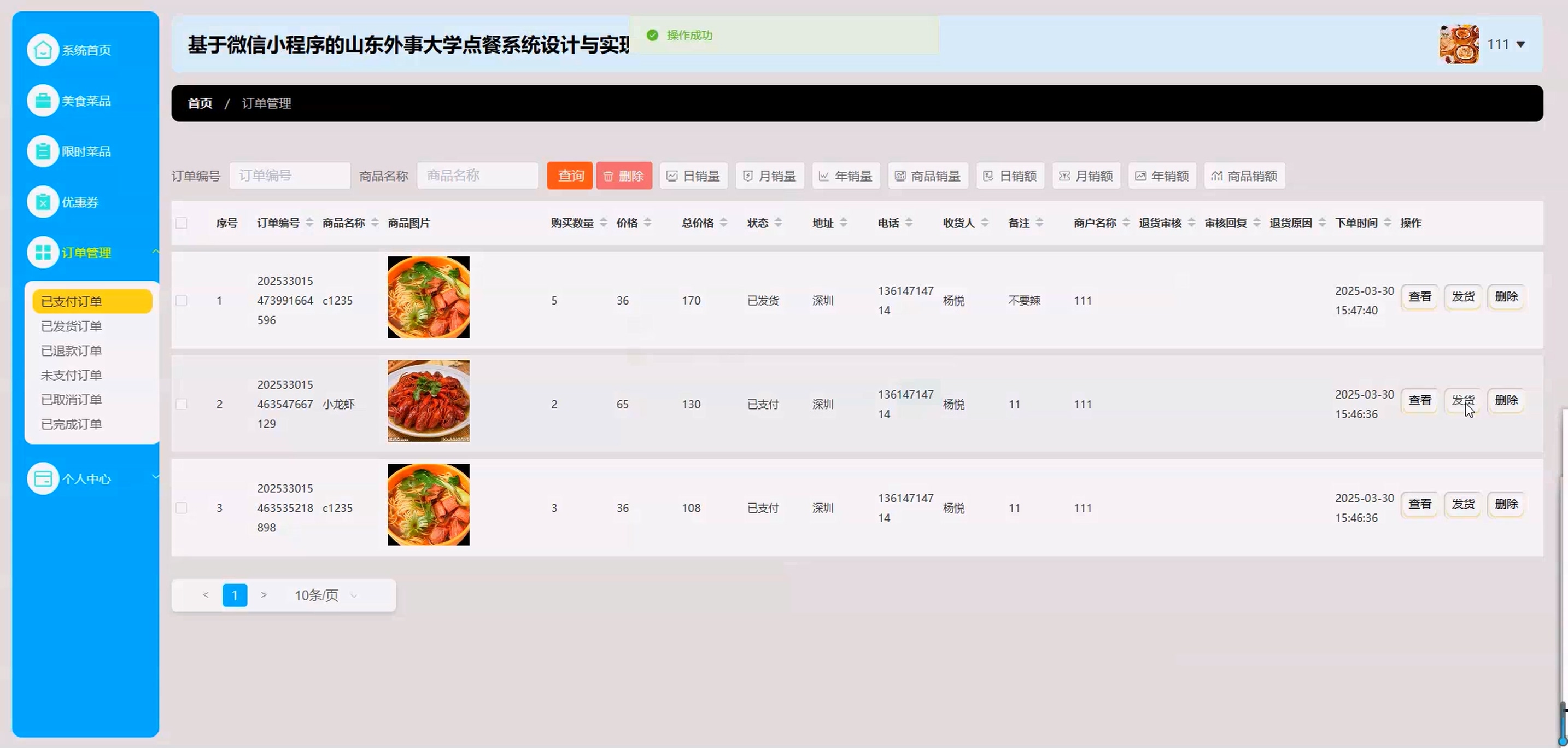 (2) 管理员(服务端):系统首页、商家、用户、美食分类、美食菜品、限时菜品、举报记录、优惠券、论坛分类、社交互动、系统管理、订单管理、个人中心