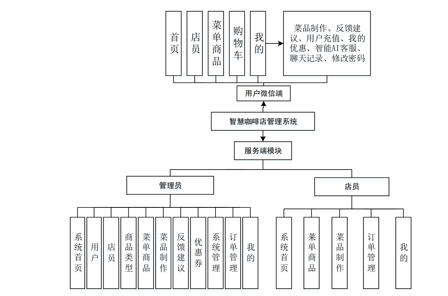 (协同过滤推荐算法+AI智能助手)基于微信小程序的智慧咖啡店管理系统分为用户微信端、服务端模块(含管理员、店员)两个层级,具体功能如下: