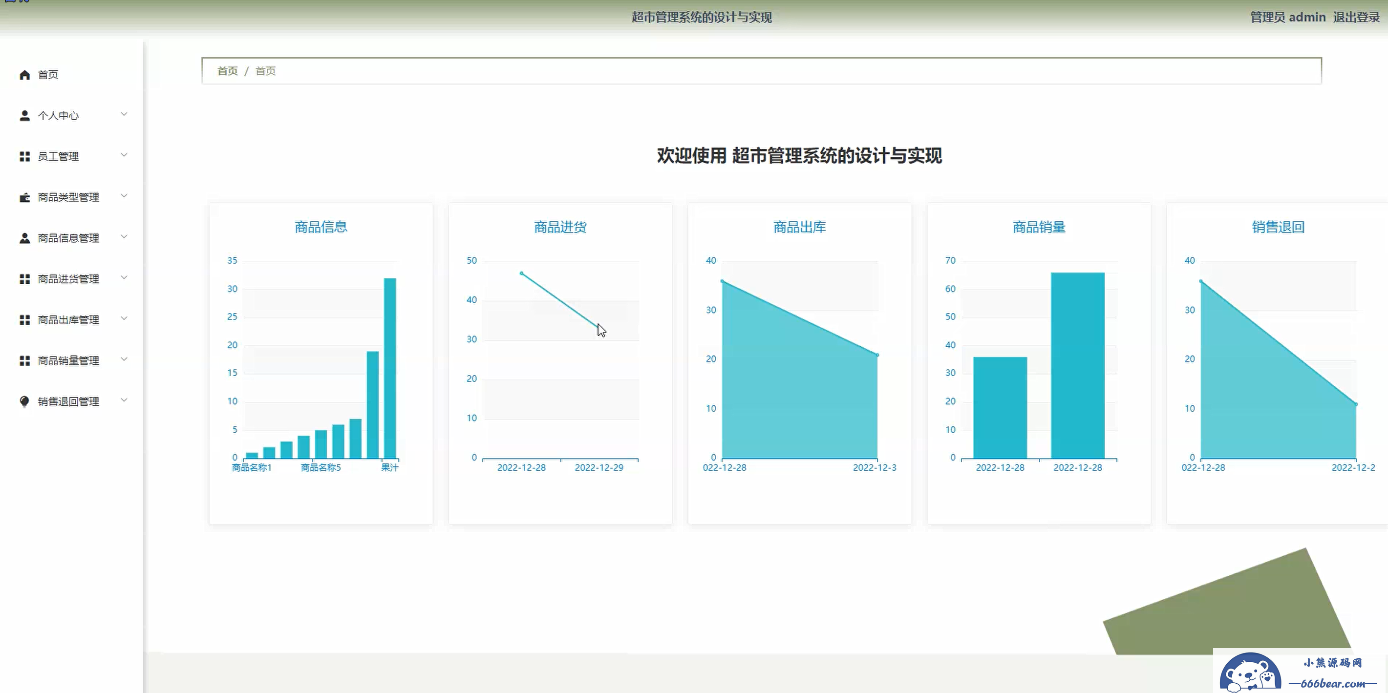 管理员:管理员登录进入超市管理系统的实现可以查看首页、个人中心、员工管理、商品类型管理、商品信息管理、商品进货管理、商品出库管理、商品销量管理、销售退回管理等信息,