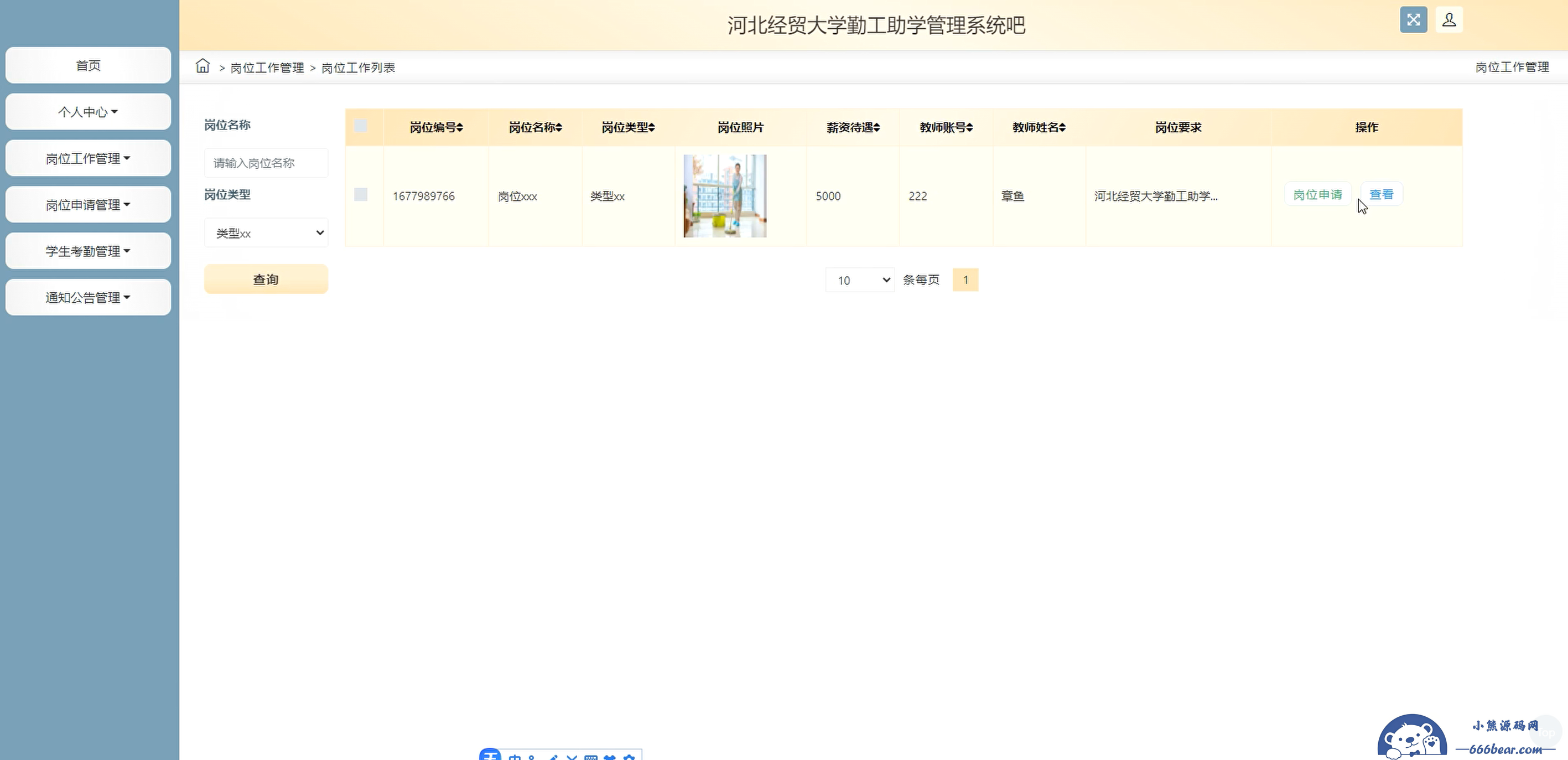 教师:查看首页、个人中心、学生管理、教师考勤管理、岗位工作管理、岗位申请管理、学生考勤管理、通知公告管理等内容,进行相应操作,
