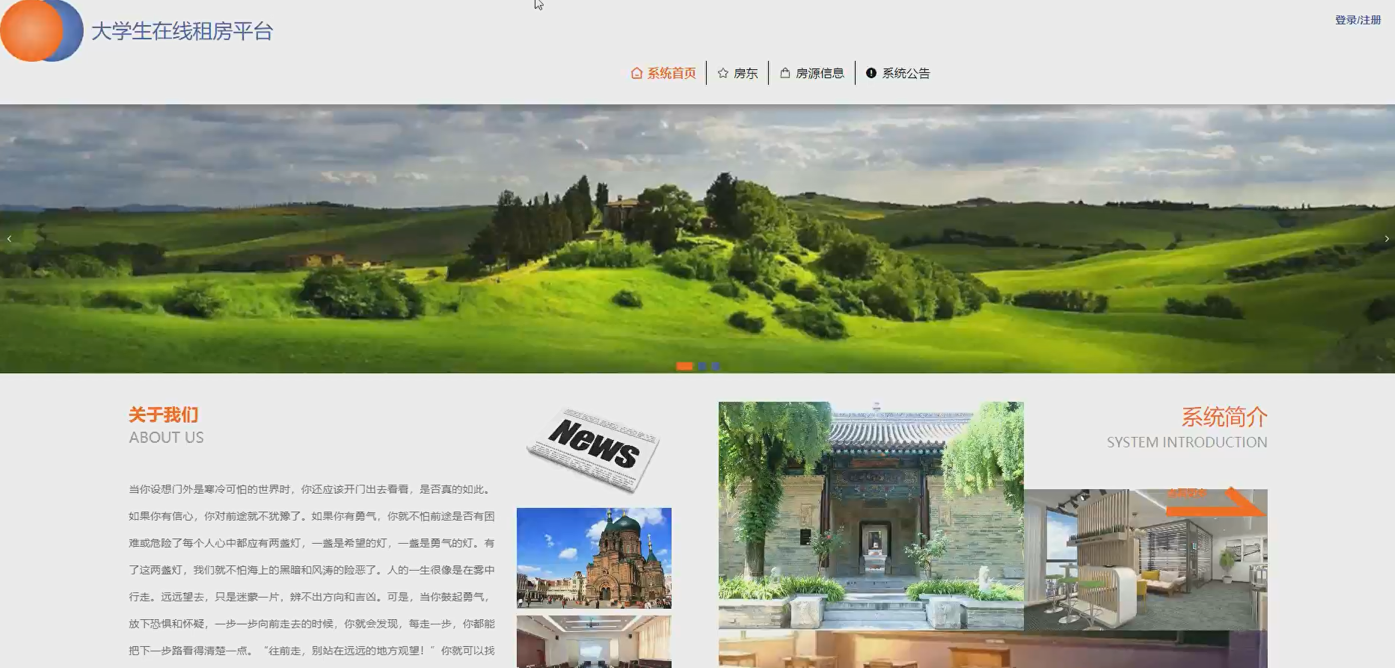 租户:当游客打开系统的网址后,首先看到的就是首页界面。在这里,游客能够看到大学生在线租房平台的导航条显示系统首页、房东、房源信息、系统公告、个人中心。