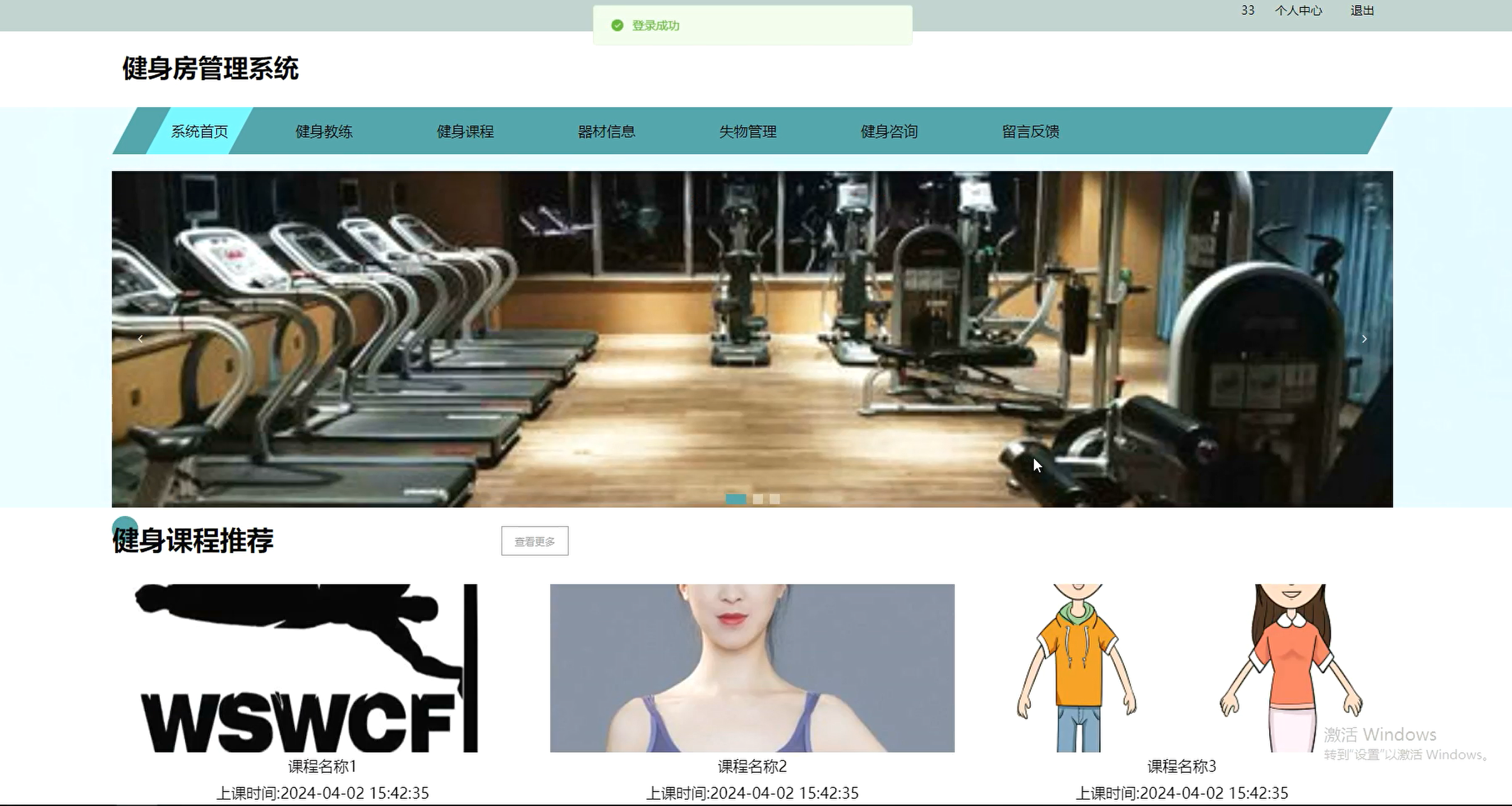 用户:当当人们打开系统的网址后,首先看到的就是首页界面。在这里,人们能够看到健身房管理系统的系统首页、健身教练、健身课程、器材信息、失物管理、健身咨询、留言反馈等。在个人中心页面可以对修改密码、预约课程、课程签到、预约取消、器材租用、器材归还、会员等级、购买会员、我的地址、我的收藏进行详细操作;