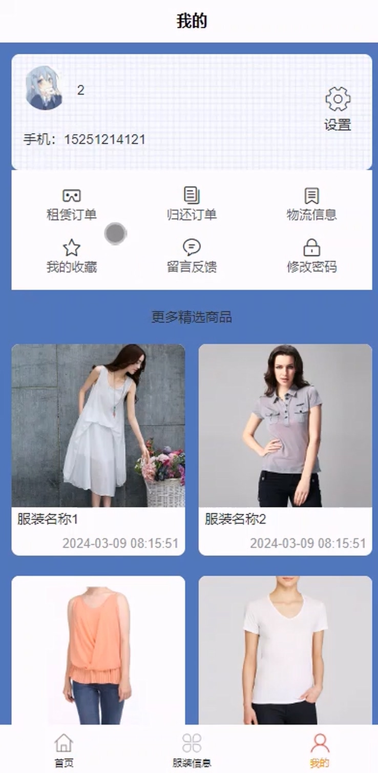 用户:当用户微信小程序的网址后,首先看到的就是首页界面。在这里,用户能够看到服装租赁系统的低部导航条显首页、服装信息、我的 等,